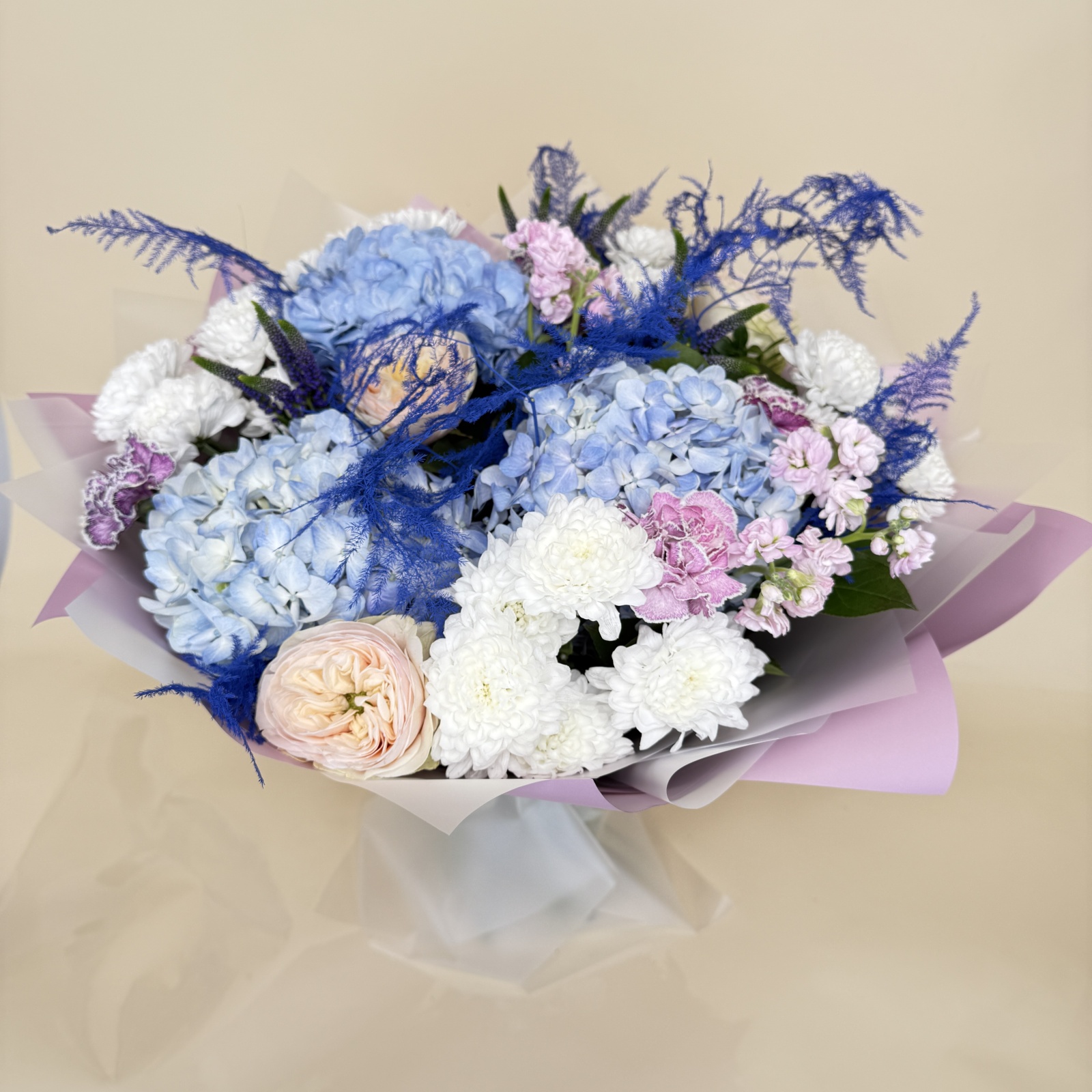 Состав: гвоздика 8, хризантема кустовая 5, гортензия 3, роза 3, маттиола 2, салал 0,5 и прочее. под заказ