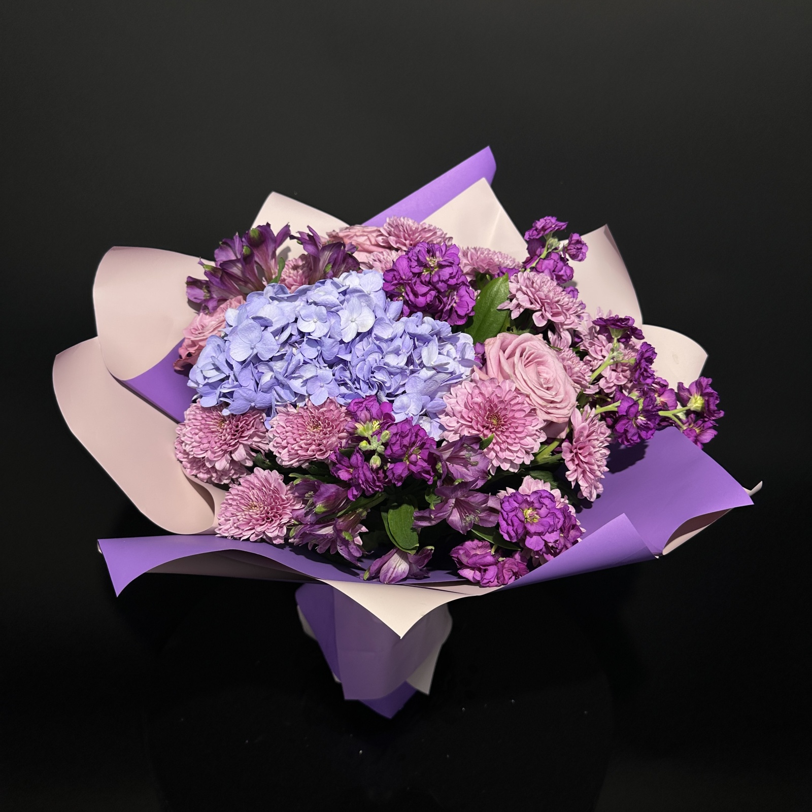 Состав: маттиола 5, хризантема кустовая 5, роза 3, альстромерия 2, гортензия 1, рускус 1 и прочее. под заказ