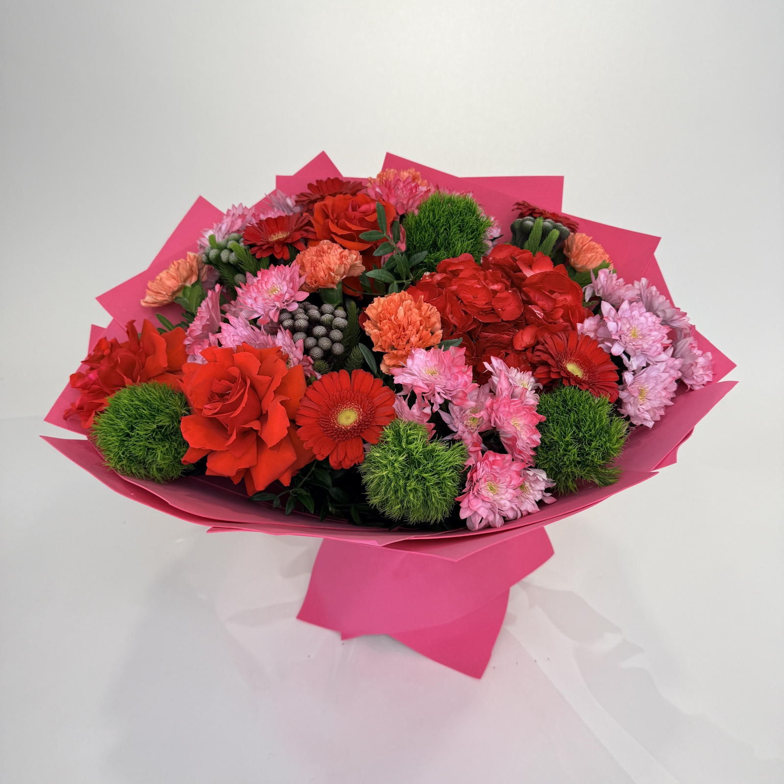 Состав: гвоздика 9, хризантема кустовая 5, гербера 5, бруния 3, роза 3, гортензия 1, фисташка 0,5 и прочее. под заказ