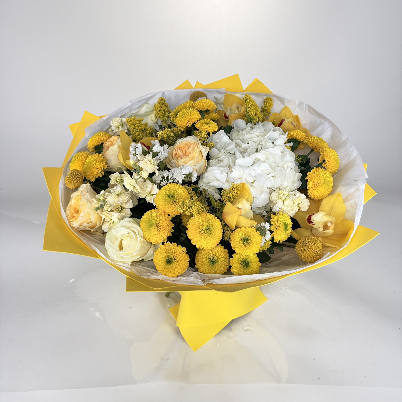 Состав: роза 9, хризантема кустовая 5, маттиола 3, солидаго 3, статица 1, гортензия 1, рускус 0,5, ветка цимбидиум 0,3 и прочее. под заказ