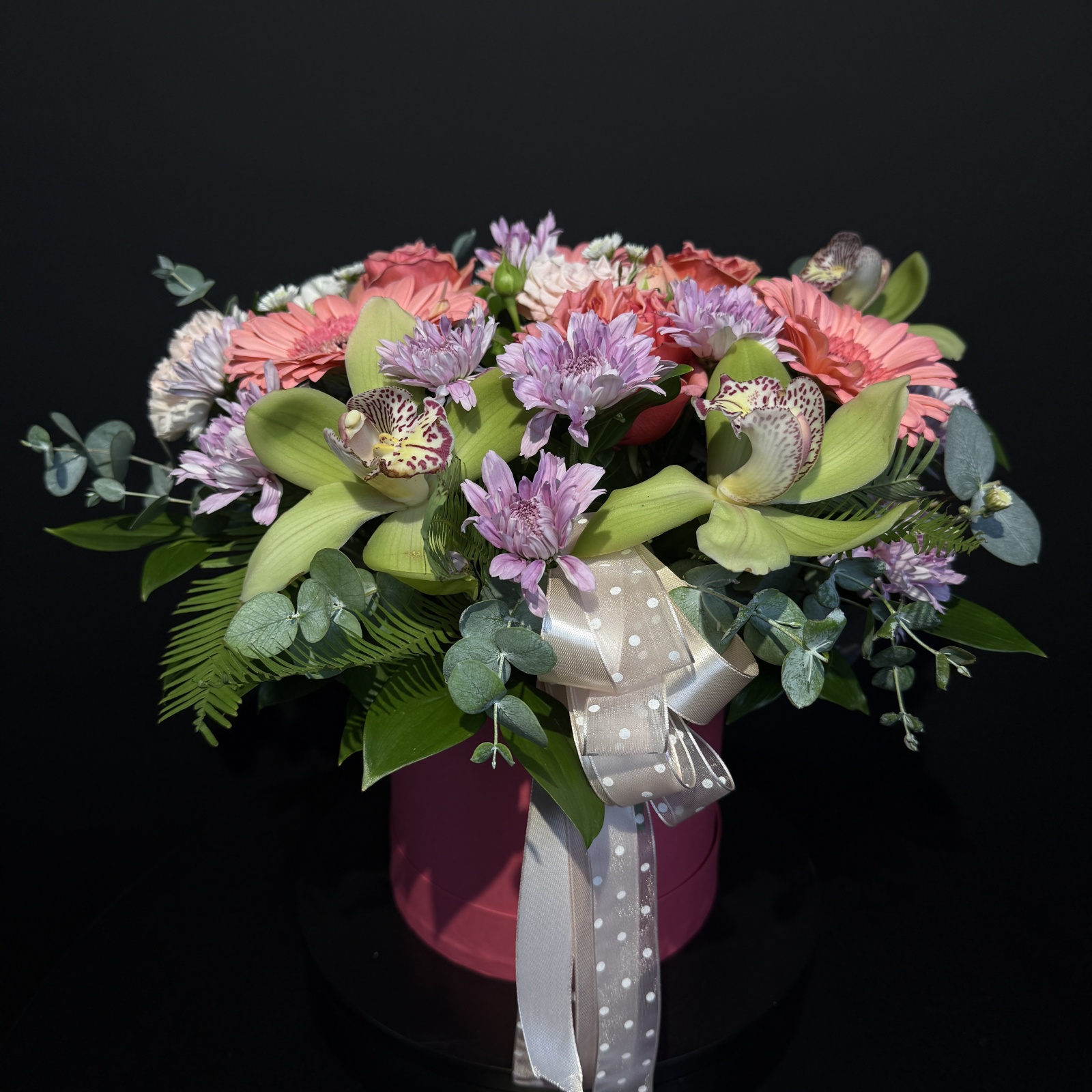 Состав: роза 3, гвоздика 3, гербера 3, эвкалипт 1, рускус 0,5, ветка цимбидиум 0,4 и прочее. под заказ