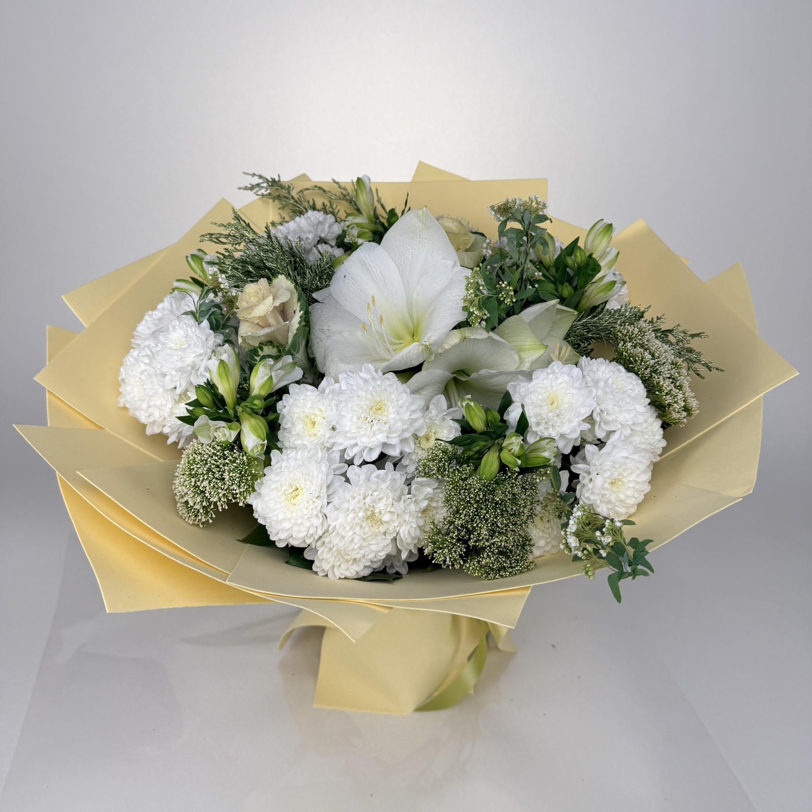 Состав: альстромерия 5, хризантема кустовая 5, роза 1, рускус 0,5 и прочее. под заказ