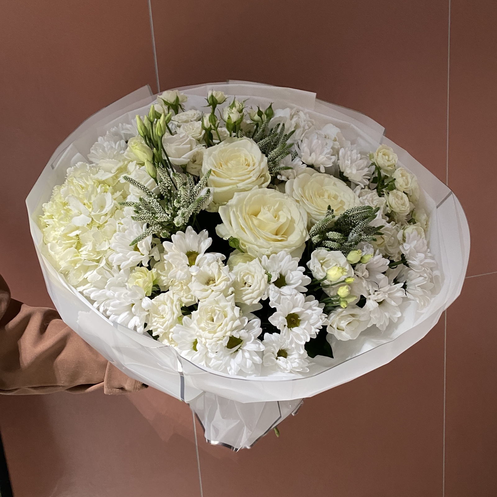 Состав: хризантема кустовая 4, роза 3, роза кустовая 3, гортензия 2, лизиантус 2, рускус 1 и прочее.
