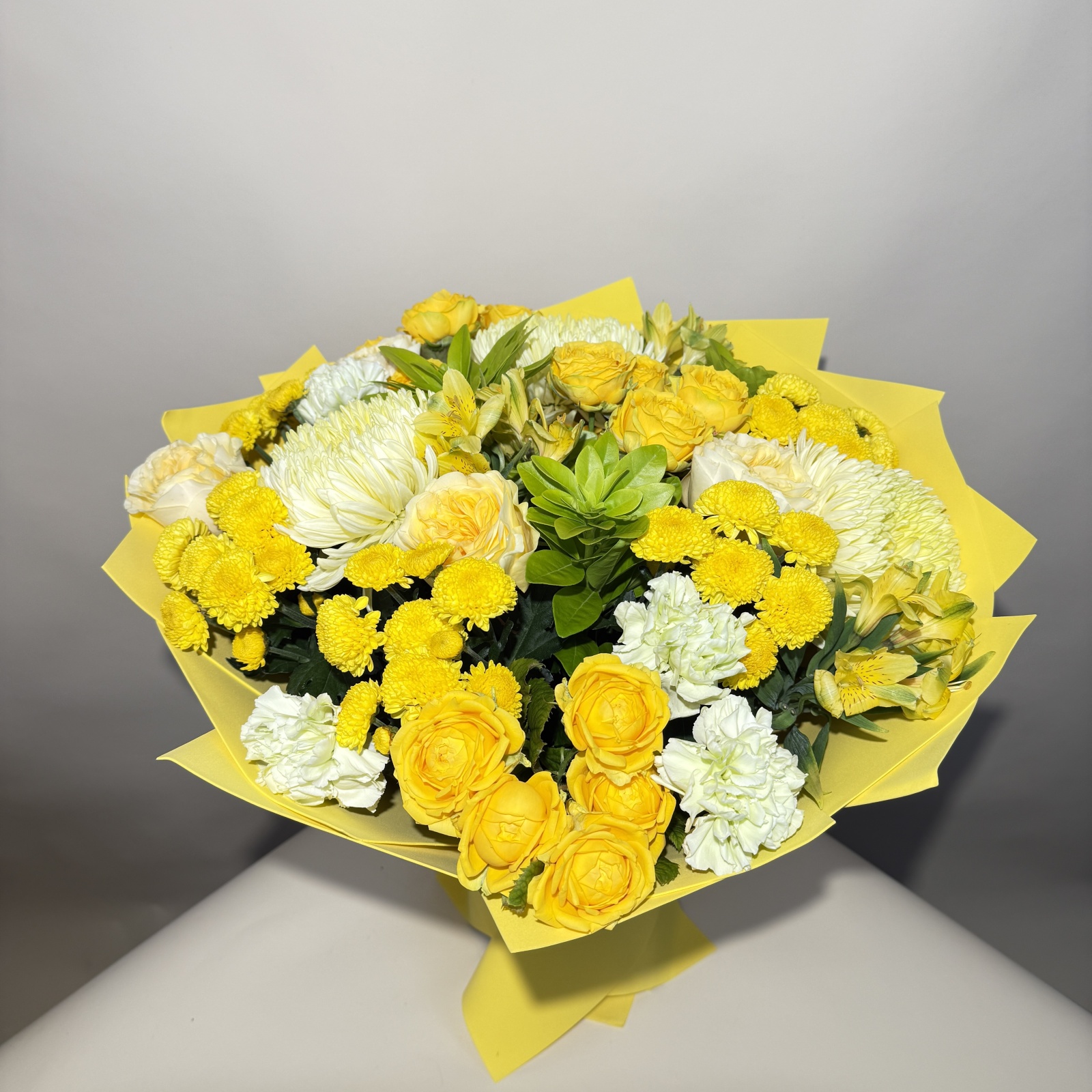 Состав: гвоздика 5, хризантема кустовая 5, роза 4, чоисия 3, роза кустовая 3, хризантема 3 и прочее. под заказ