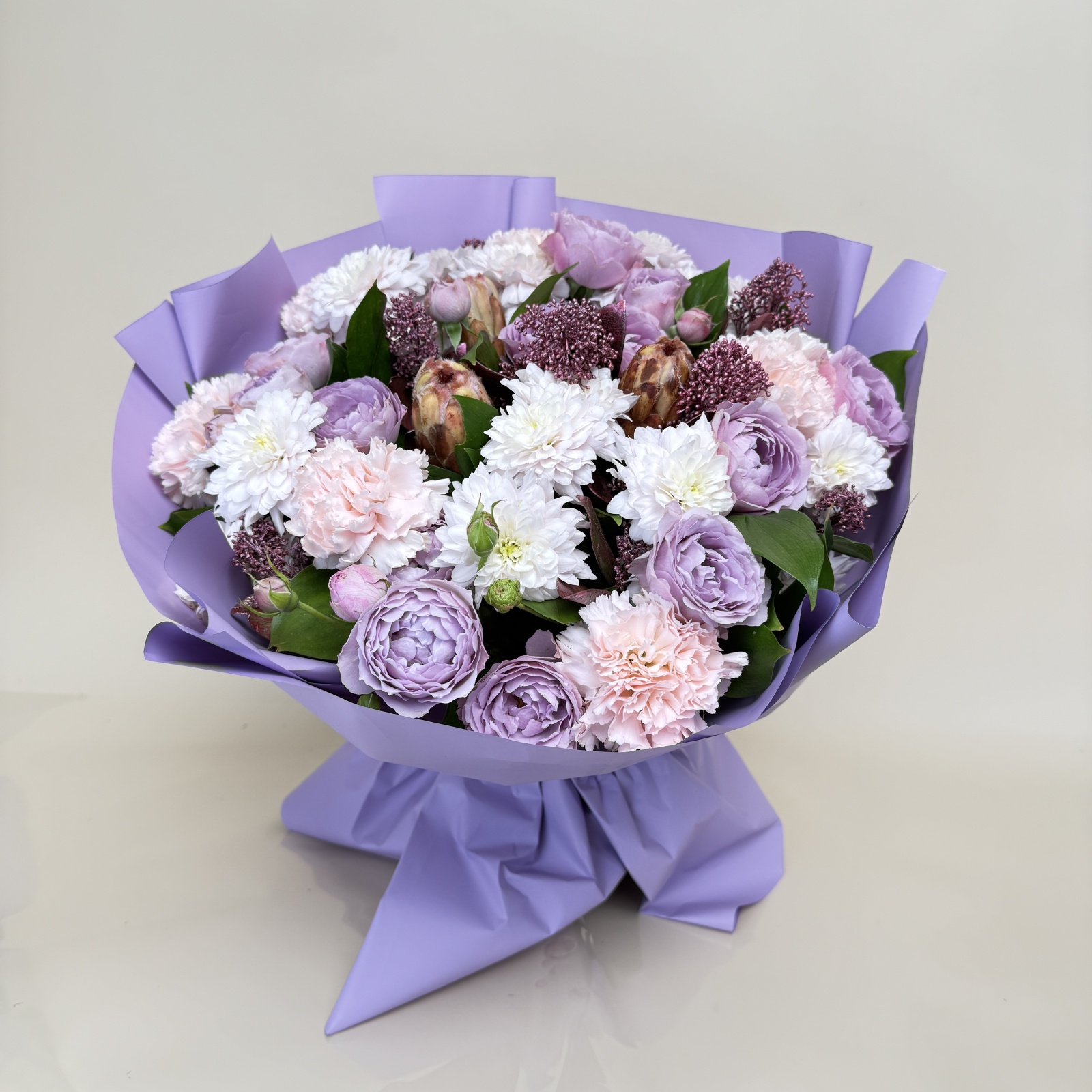 Состав: гербера 7, гвоздика 6, хризантема кустовая 5, рускус 1 и прочее.