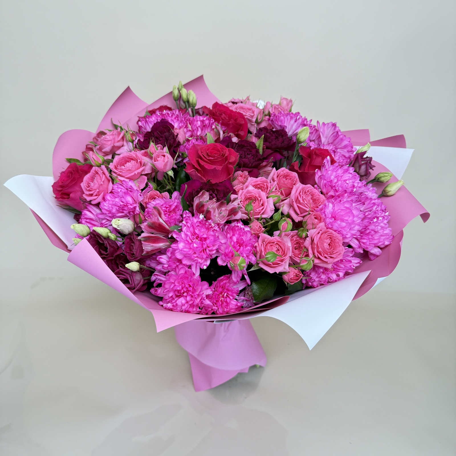 Состав: гвоздика 5, хризантема кустовая 5, роза 4, лизиантус 3, роза кустовая 3, альстромерия 3, гиацинт 2 и прочее. под заказ