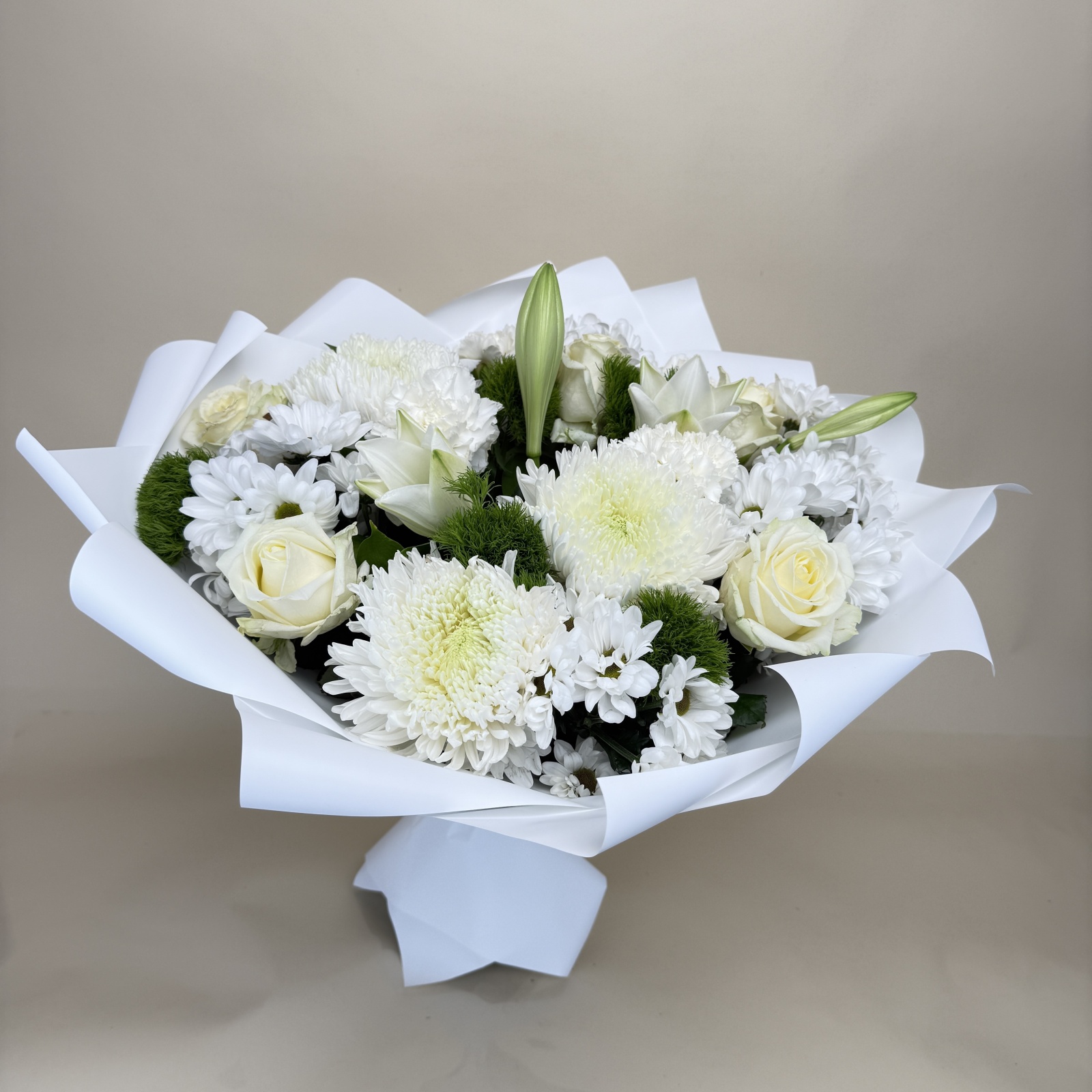 Состав: гвоздика 16, хризантема кустовая 5, роза 5, хризантема 3, лилия 2 и прочее.