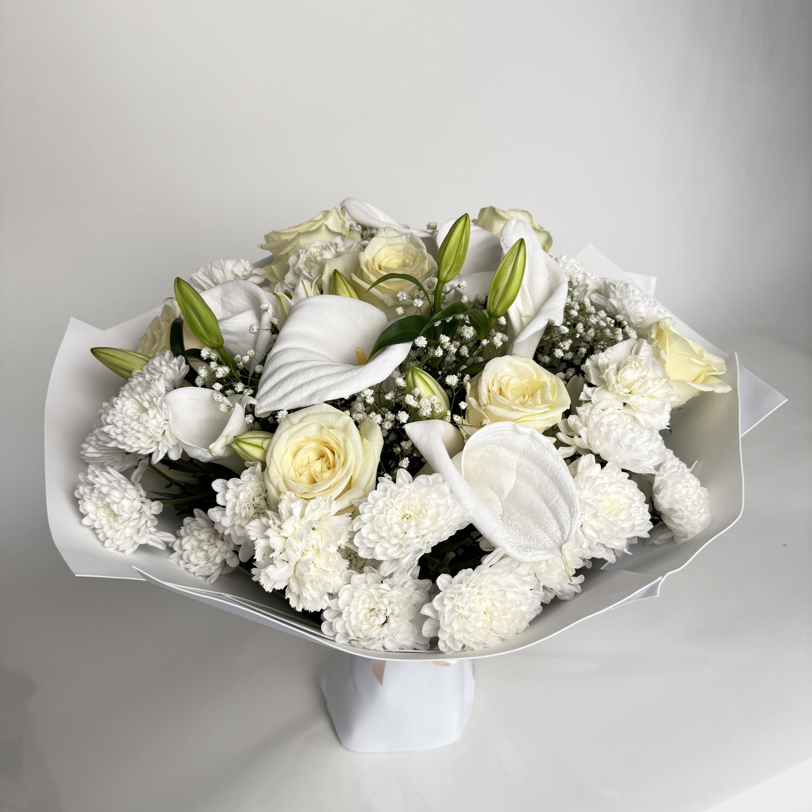 Состав: роза 6, гвоздика 5, хризантема кустовая 5, гипсофила 5, лилия 2 и прочее.