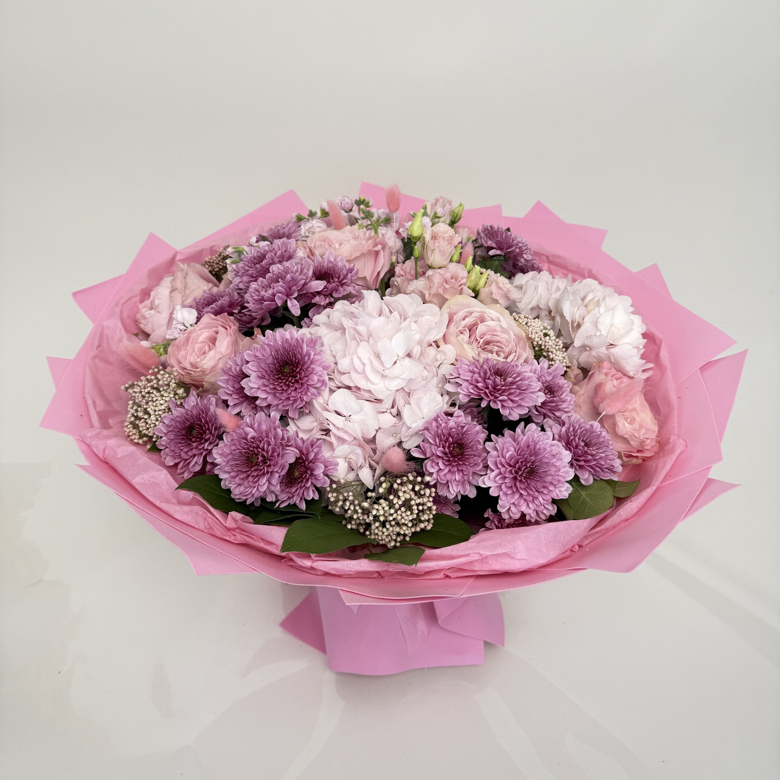 Состав: роза 5, хризантема кустовая 5, маттиола 3, гортензия 2, лизиантус 2, салал 0,5 и прочее.