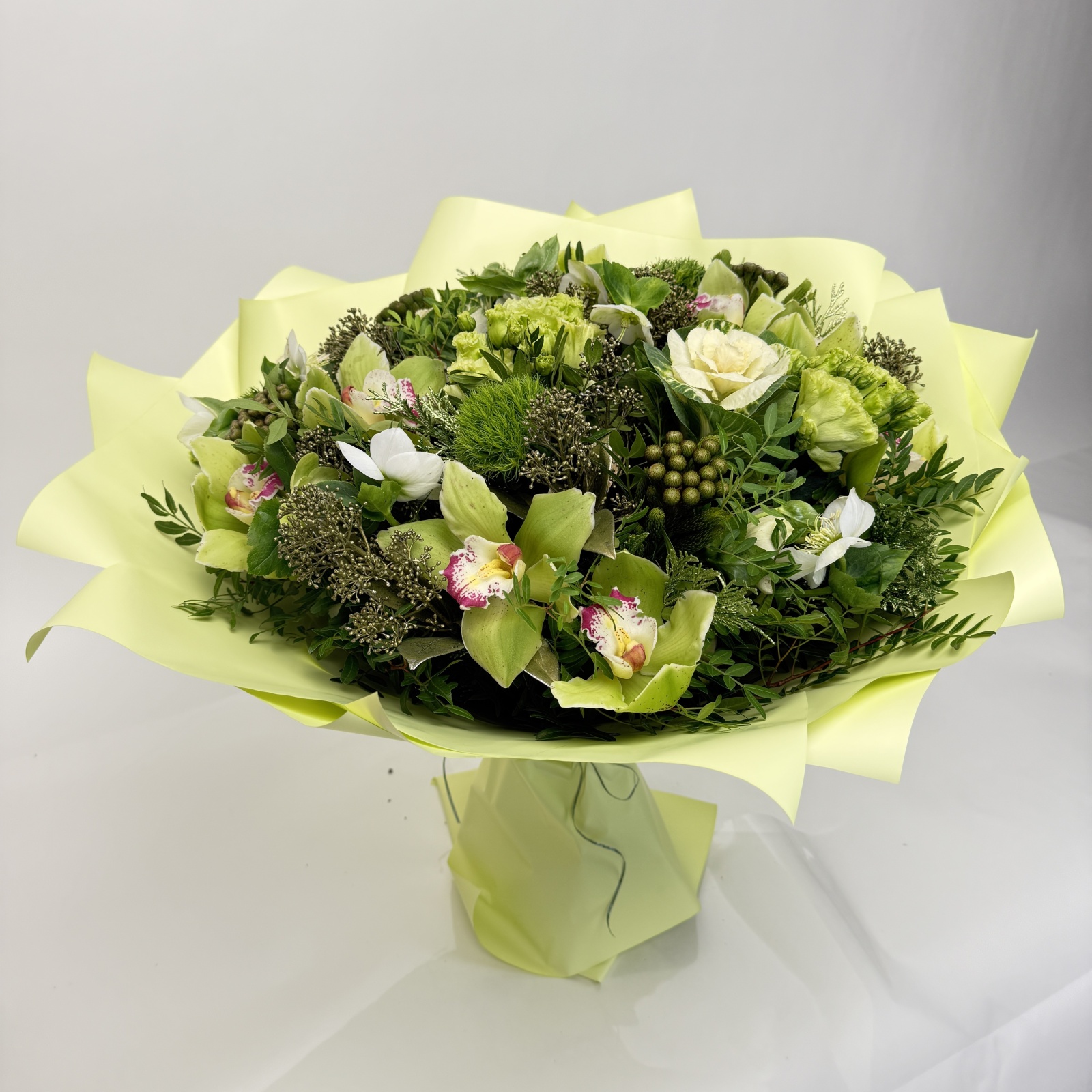 Состав: гвоздика 5, бруния 5, лизиантус 3, хеллеборус 3, фисташка 1, ветка цимбидиум 0,3 и прочее. под заказ