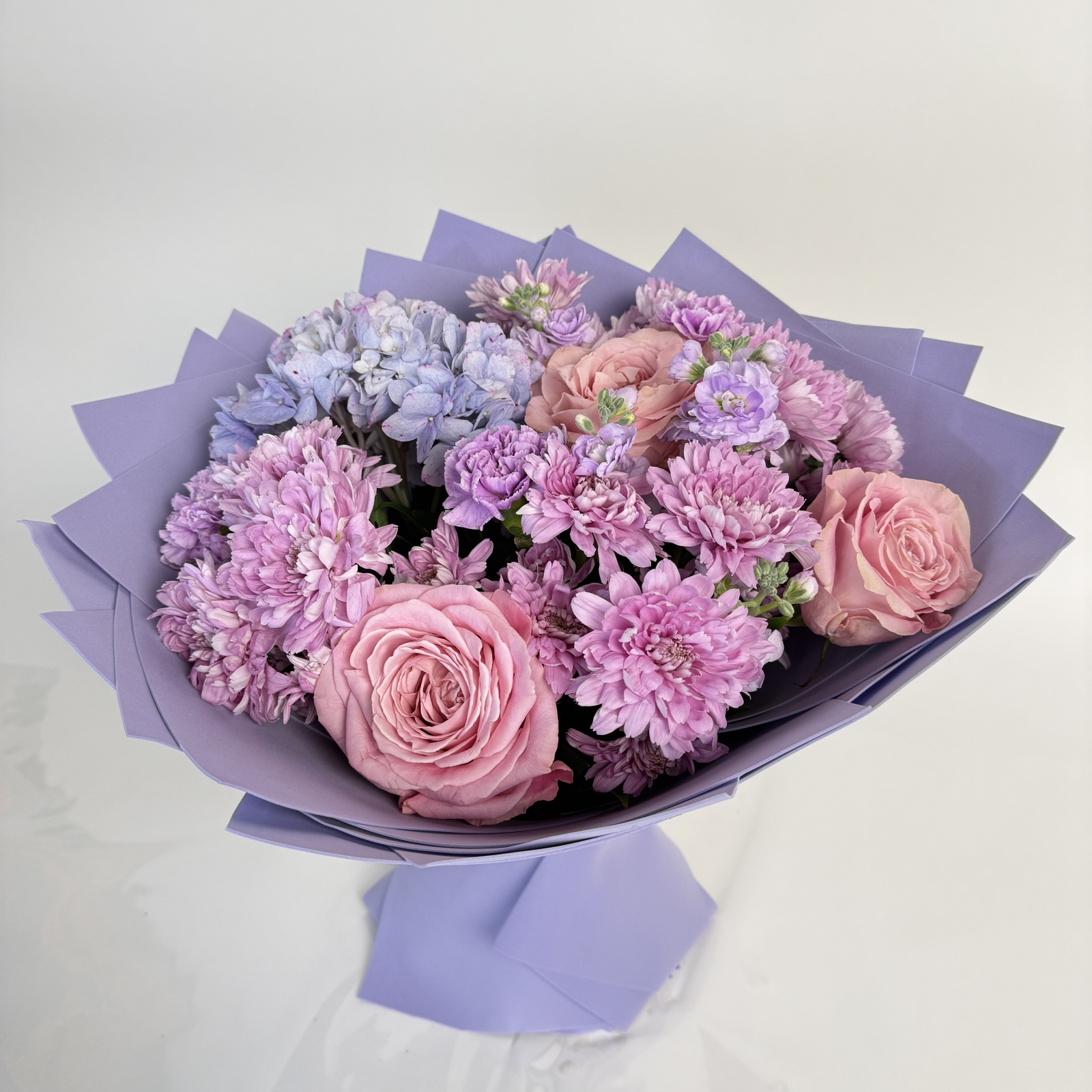 Состав: хризантема кустовая 5, гвоздика 4, роза 3, маттиола 2, гортензия 1, рускус 0,5 и прочее. под заказ