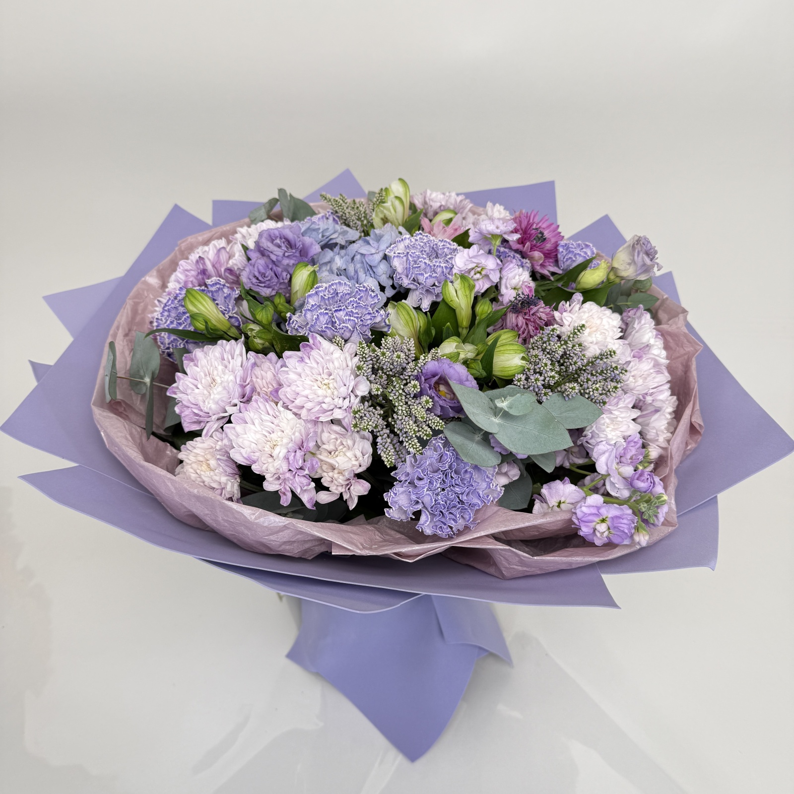 Состав: гвоздика 6, хризантема кустовая 4, альстромерия 3, анемон 3, лизиантус 3, маттиола 3, ранункулюс 1, эвкалипт 1, гортензия 1 и прочее. под заказ
