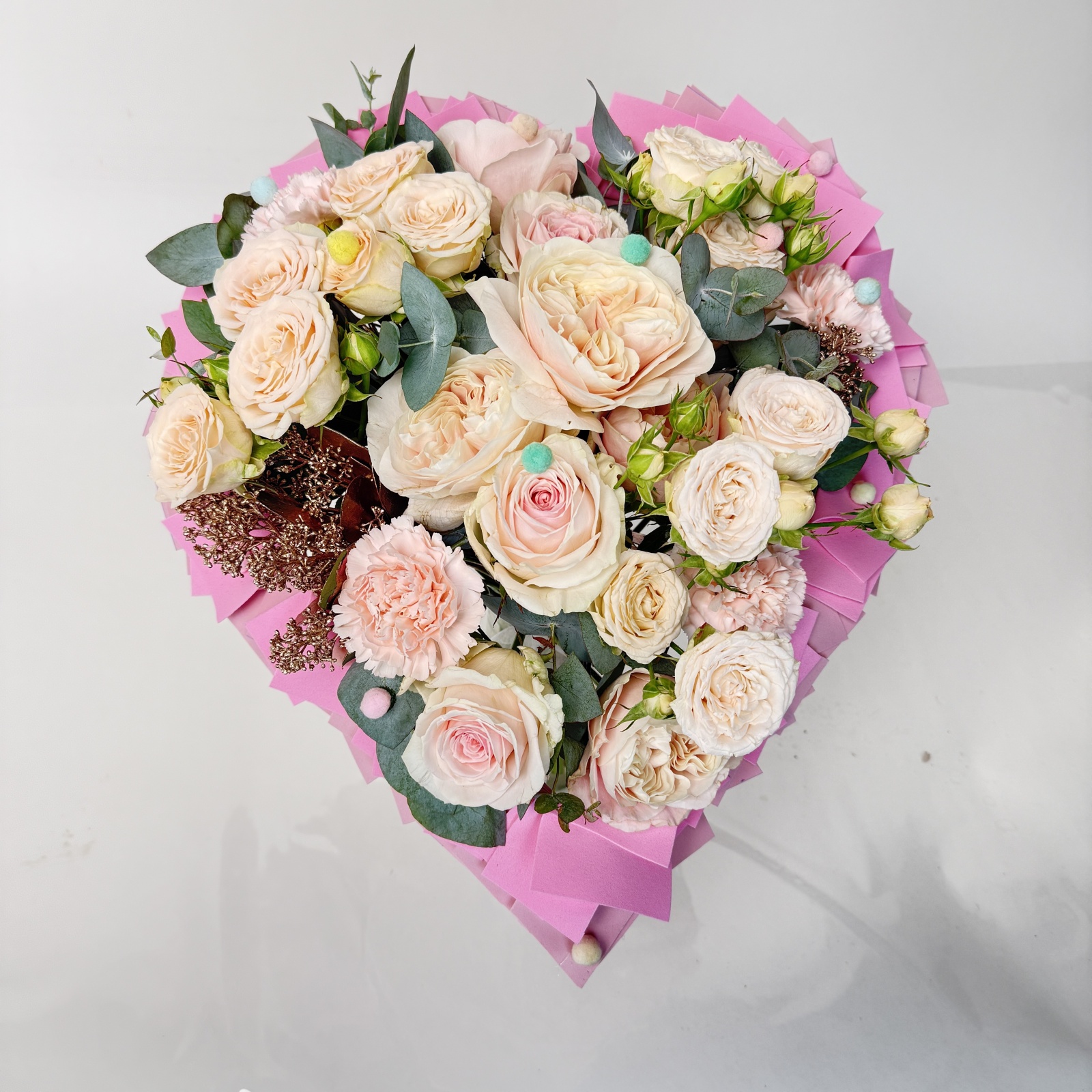 Состав: роза 9, гвоздика 6, роза кустовая 3, эвкалипт 3, гербера 1, лизиантус 1 и прочее. под заказ