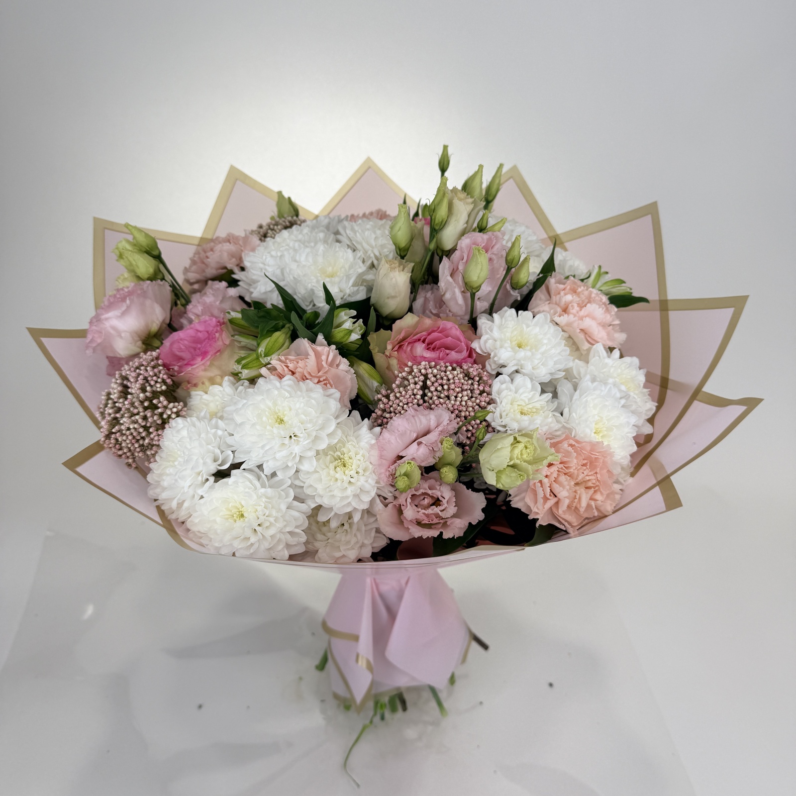 Состав: гвоздика 5, хризантема кустовая 5, роза 3, альстромерия 3, лизиантус 3, рускус 0,5 и прочее. под заказ