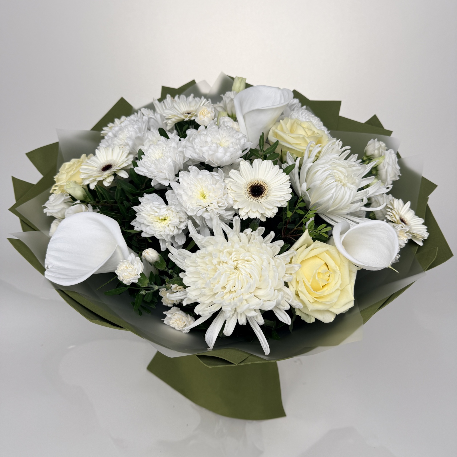 Состав: гербера 4, хризантема 3, роза 3, гвоздика 3, хризантема кустовая 3, лизиантус 2, фисташка 1 и прочее. под заказ