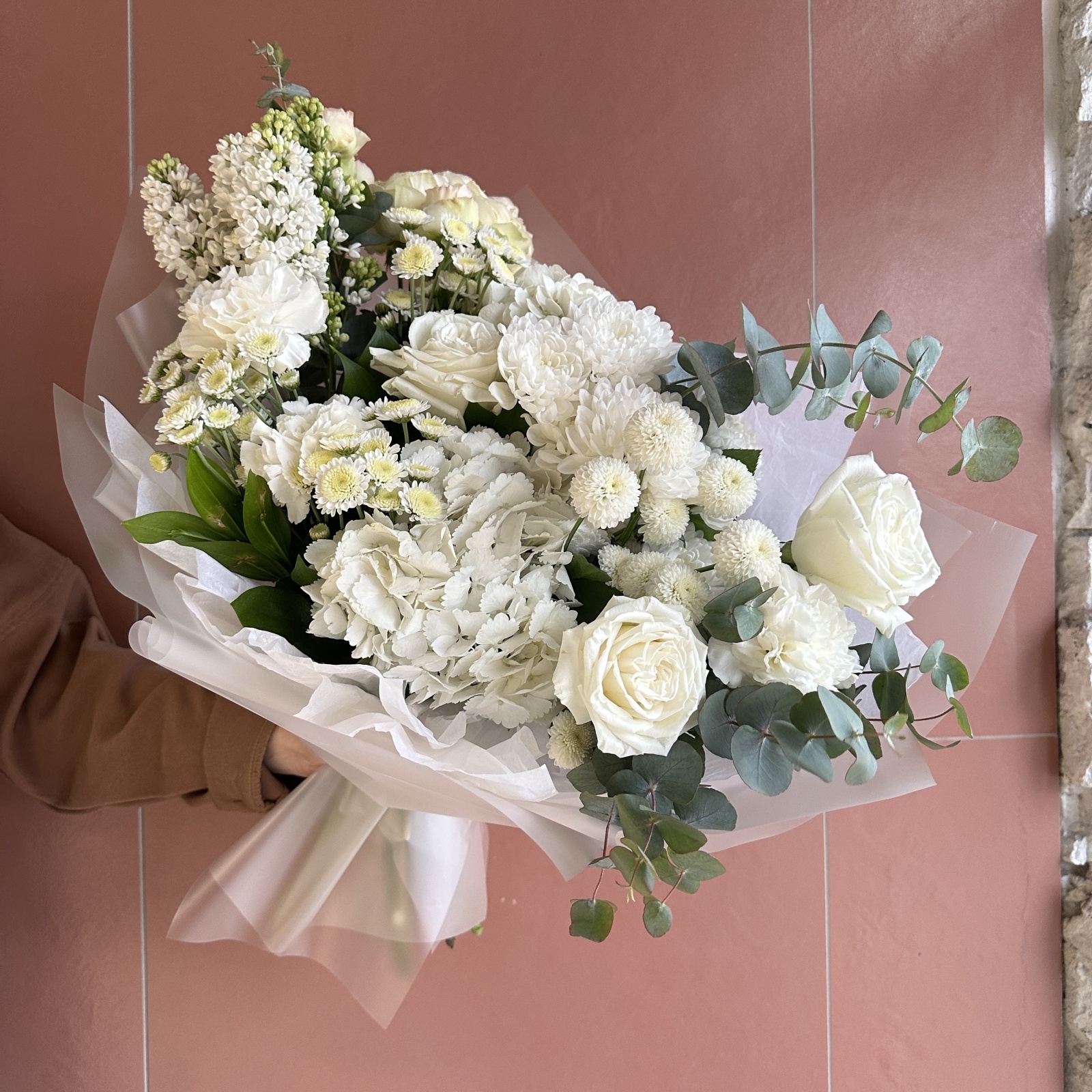 Состав: хризантема кустовая 5, роза 3, гвоздика 3, гортензия 2, эвкалипт 2, сирень 1, роза кустовая 1, рускус 0,2 и прочее. в наличии