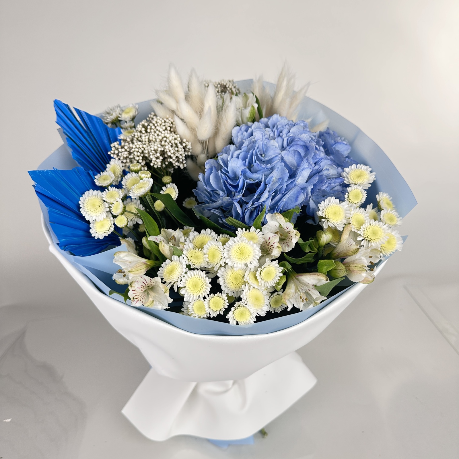 Состав: хризантема кустовая 5, роза 4, альстромерия 1, гортензия 1, рускус 0,2 и прочее. под заказ