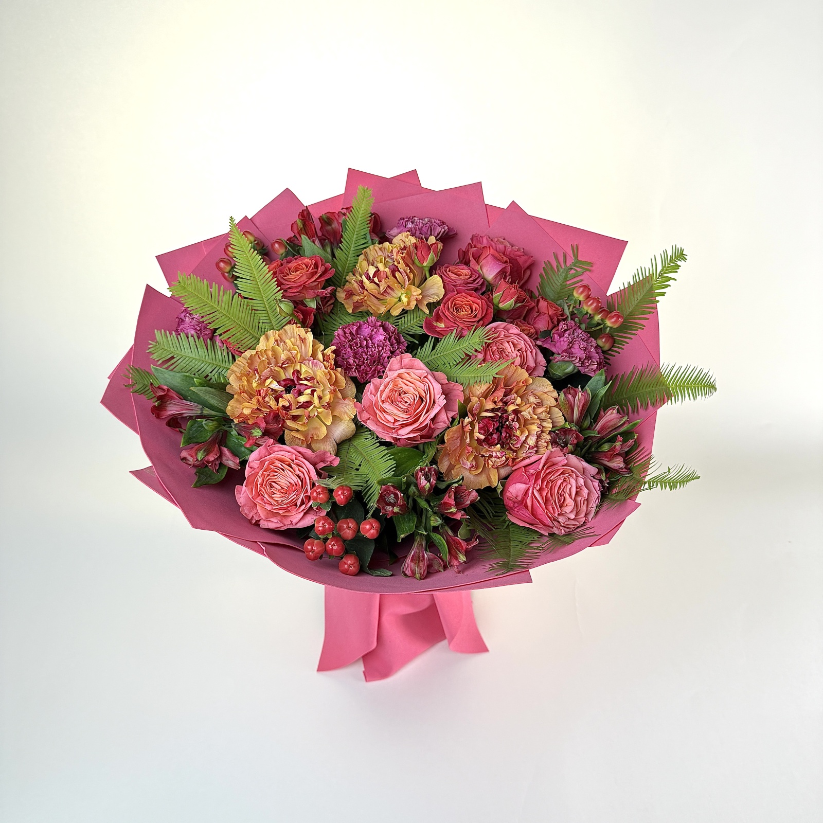 Состав: роза 5, альстромерия 4, гвоздика 4, гиперикум 3, ранункулюс 3, роза кустовая 2 и прочее.