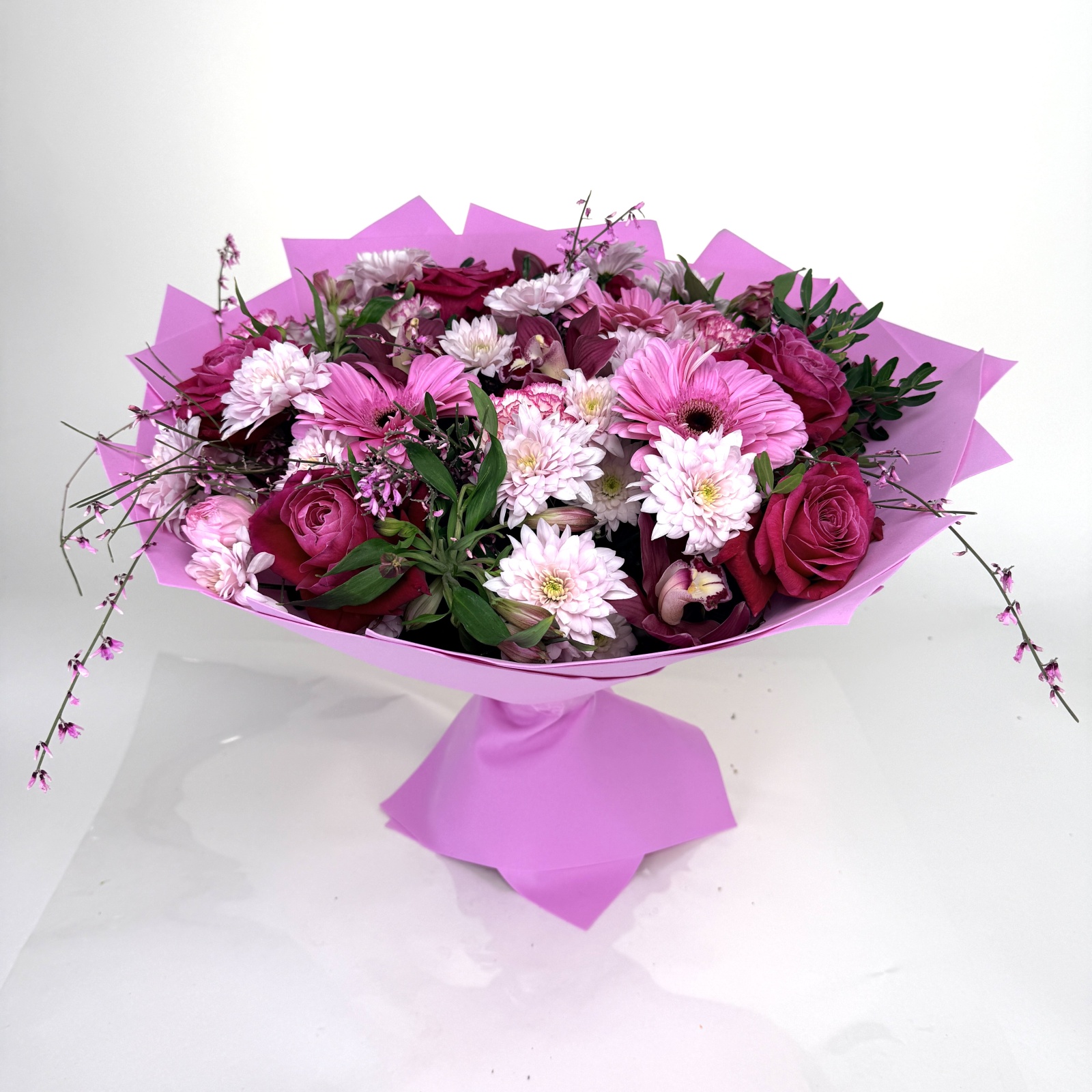 Состав: роза 7, ранункулюс 5, гвоздика 5, хризантема кустовая 5, гербера 3, альстромерия 3, фисташка 1, ветка цимбидиум 0,4 и прочее. под заказ