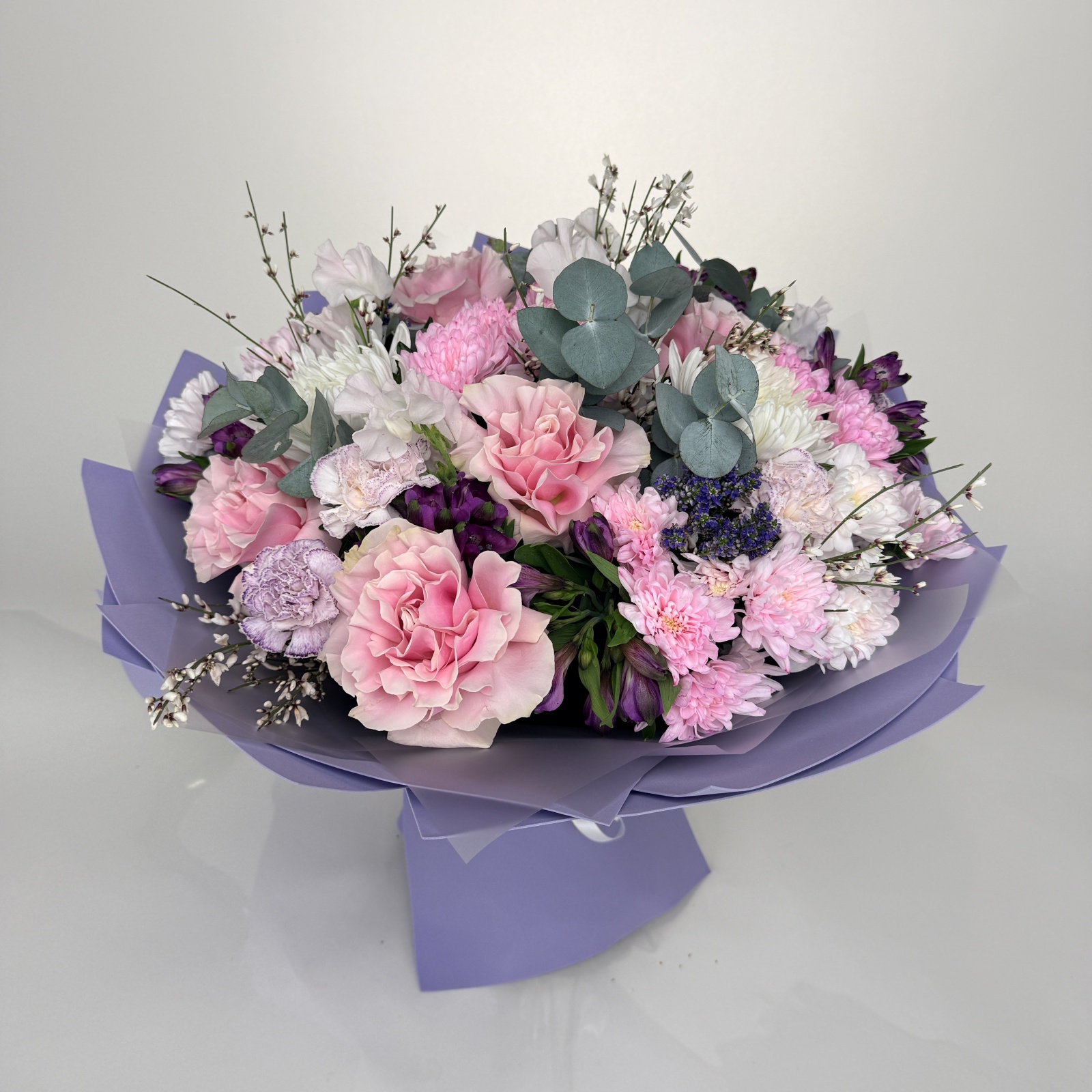 Состав: роза 5, альстромерия 5, гвоздика 5, хризантема кустовая 5, хризантема 3, фисташка 1, эвкалипт 1 и прочее. под заказ