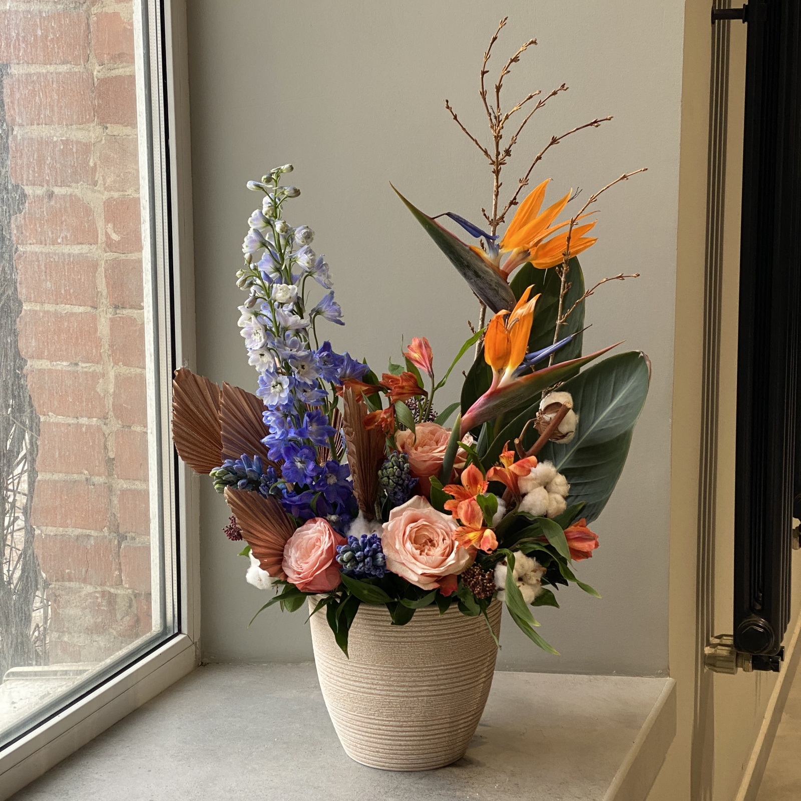 Состав: гиацинт 5, роза 3, альстромерия 3, дельфиниум 2, рускус 0,5 и прочее. в наличии