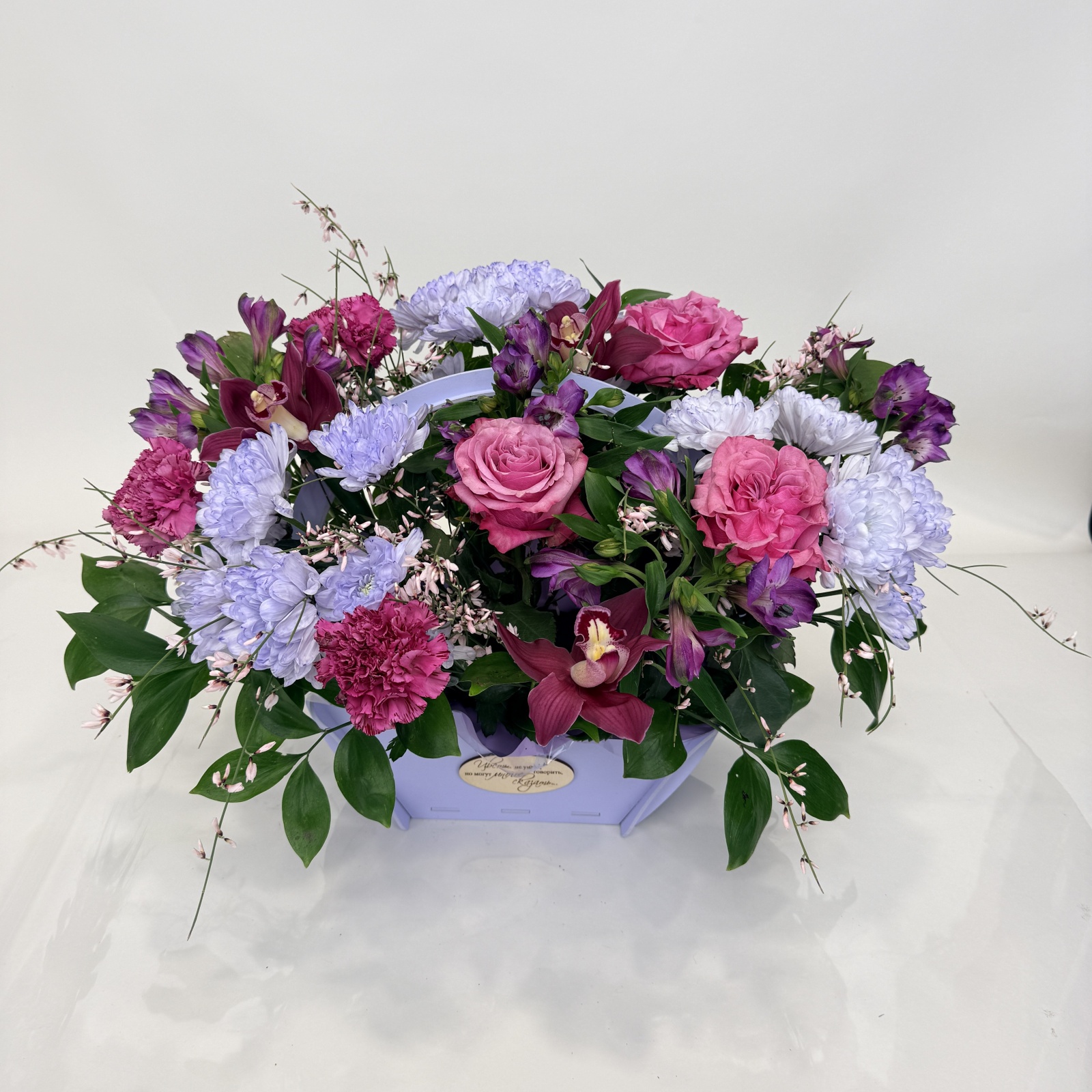 Состав: альстромерия 4, гвоздика 3, хризантема кустовая 3, роза 3, цветок ванды 1, рускус 0,5, ветка цимбидиум 0,2 и прочее. под заказ