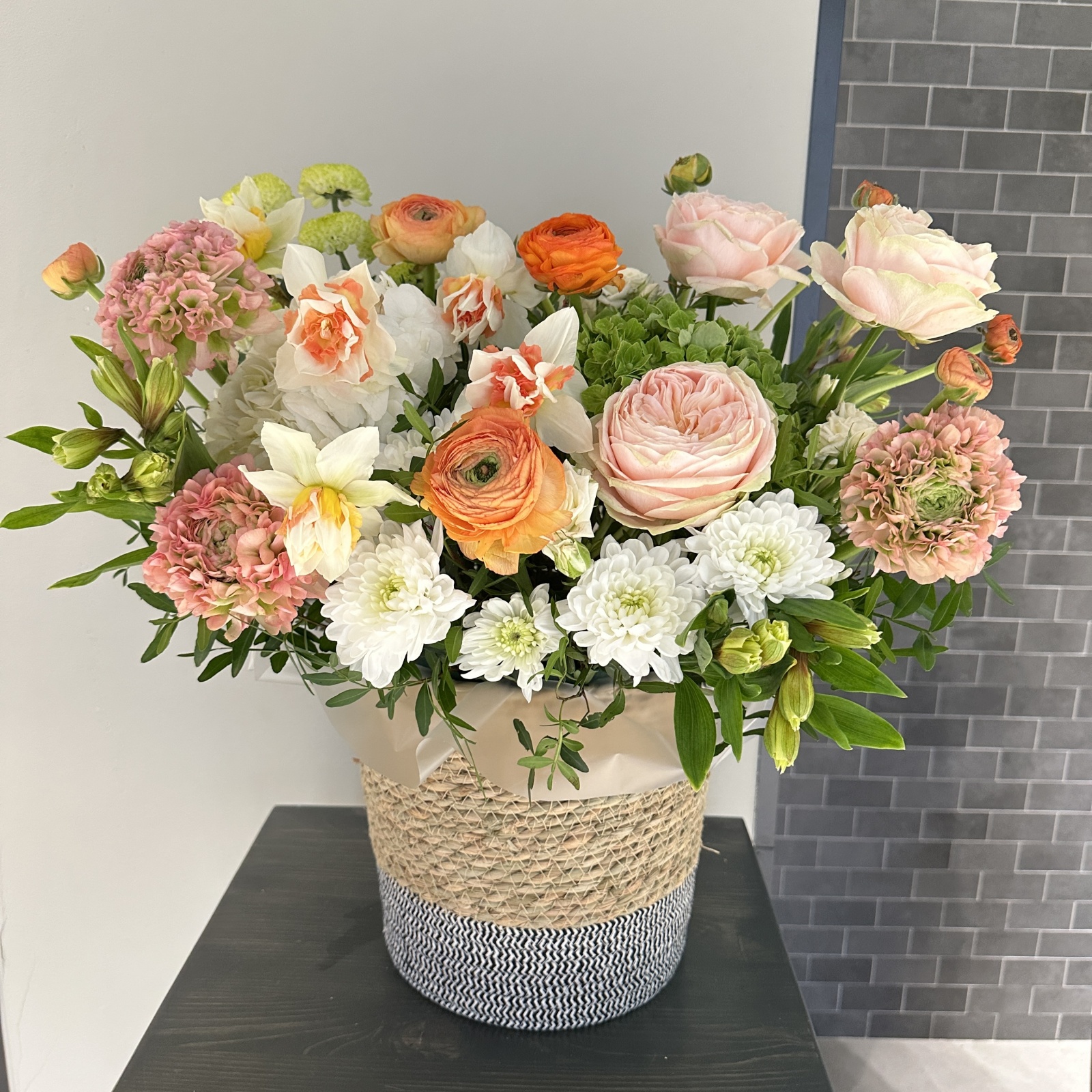 Состав: ранункулюс 6, роза 3, альстромерия 3, роза кустовая 2, хризантема кустовая 2, гортензия 2, фисташка 0,5 и прочее. под заказ