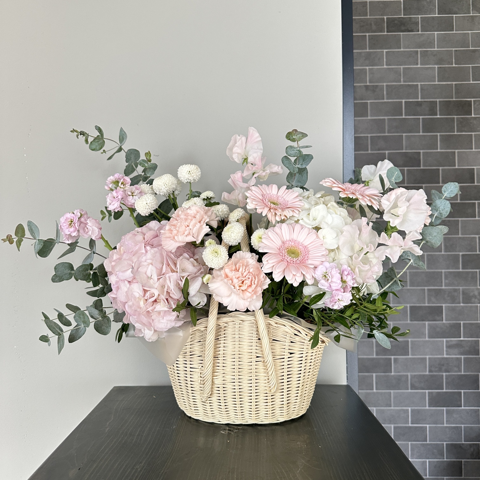 Состав: гвоздика 4, гербера 3, гортензия 2, маттиола 1, хризантема кустовая 1, эвкалипт 1, фисташка 0,2 и прочее. в наличии