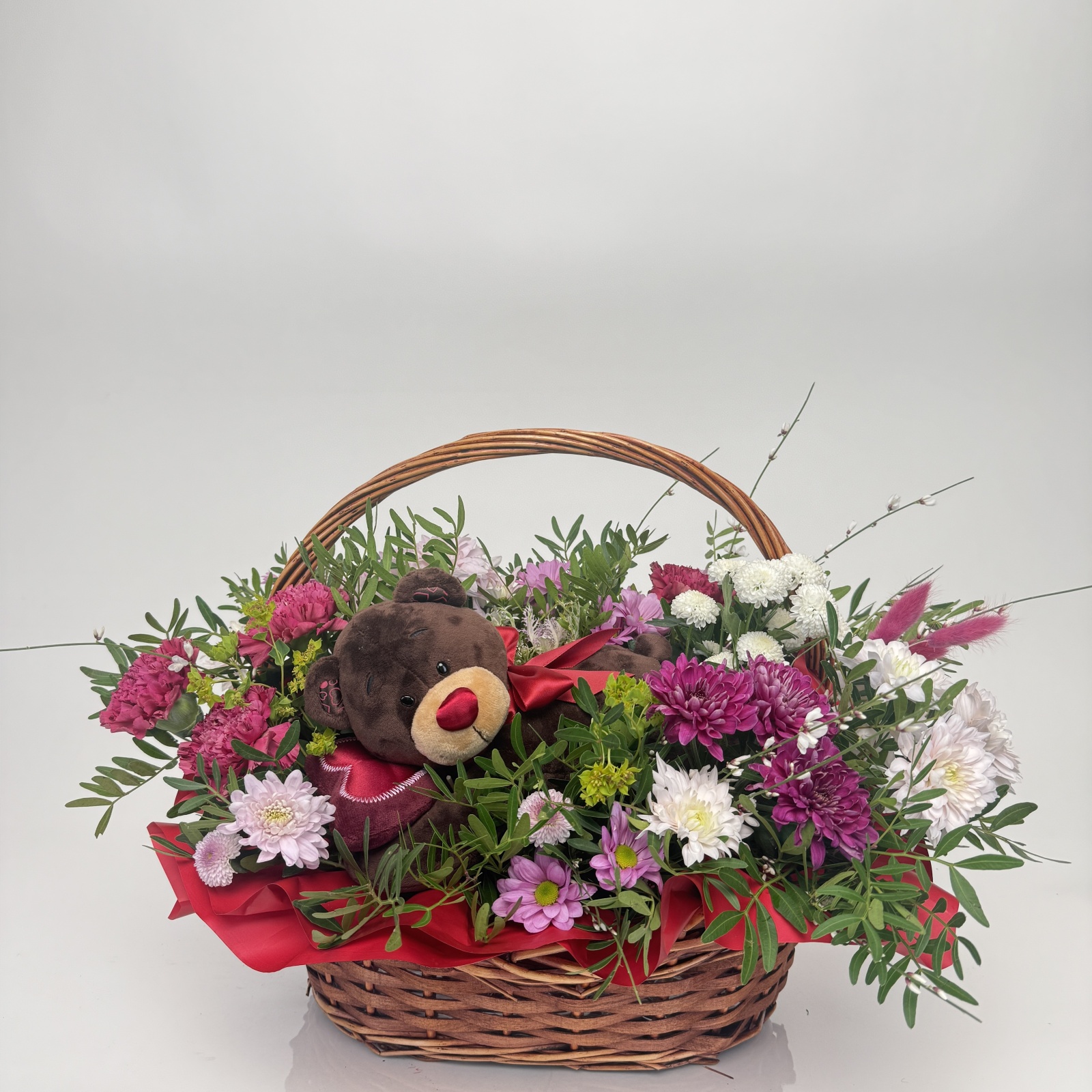 Состав: гвоздика 3, роза 3, тюльпан 2, хризантема кустовая 2, фисташка 1, хеллеборус 1, альстромерия 1 и прочее. под заказ