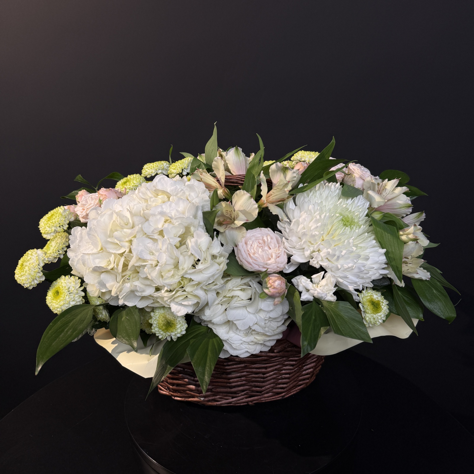Состав: альстромерия 3, хризантема кустовая 3, хризантема 2, гортензия 1, роза кустовая 1, рускус 0,5 и прочее.