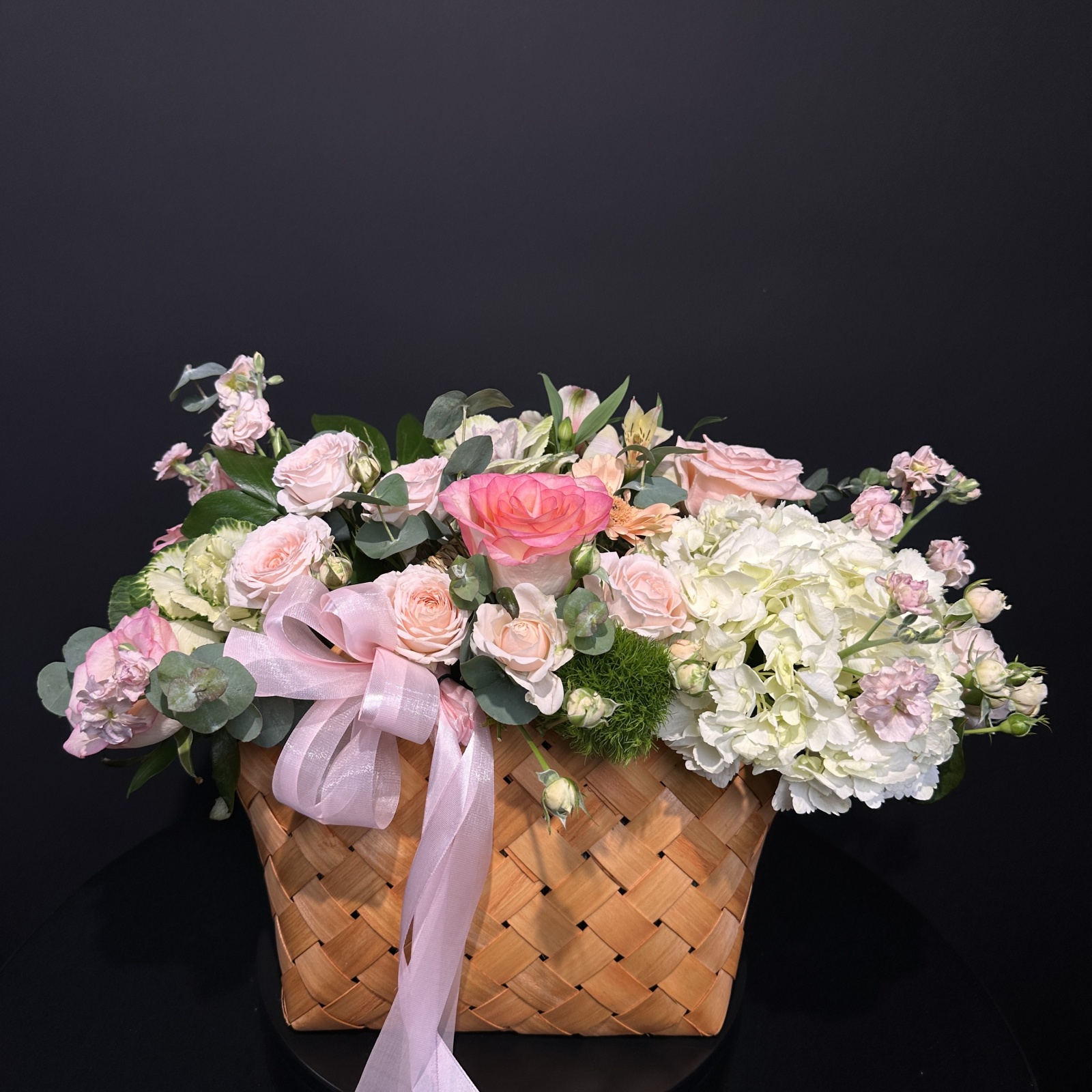 Состав: роза 3, маттиола 2, эвкалипт 1, альстромерия 1, гвоздика 1, роза кустовая 1, гербера 1, гортензия 1 и прочее.