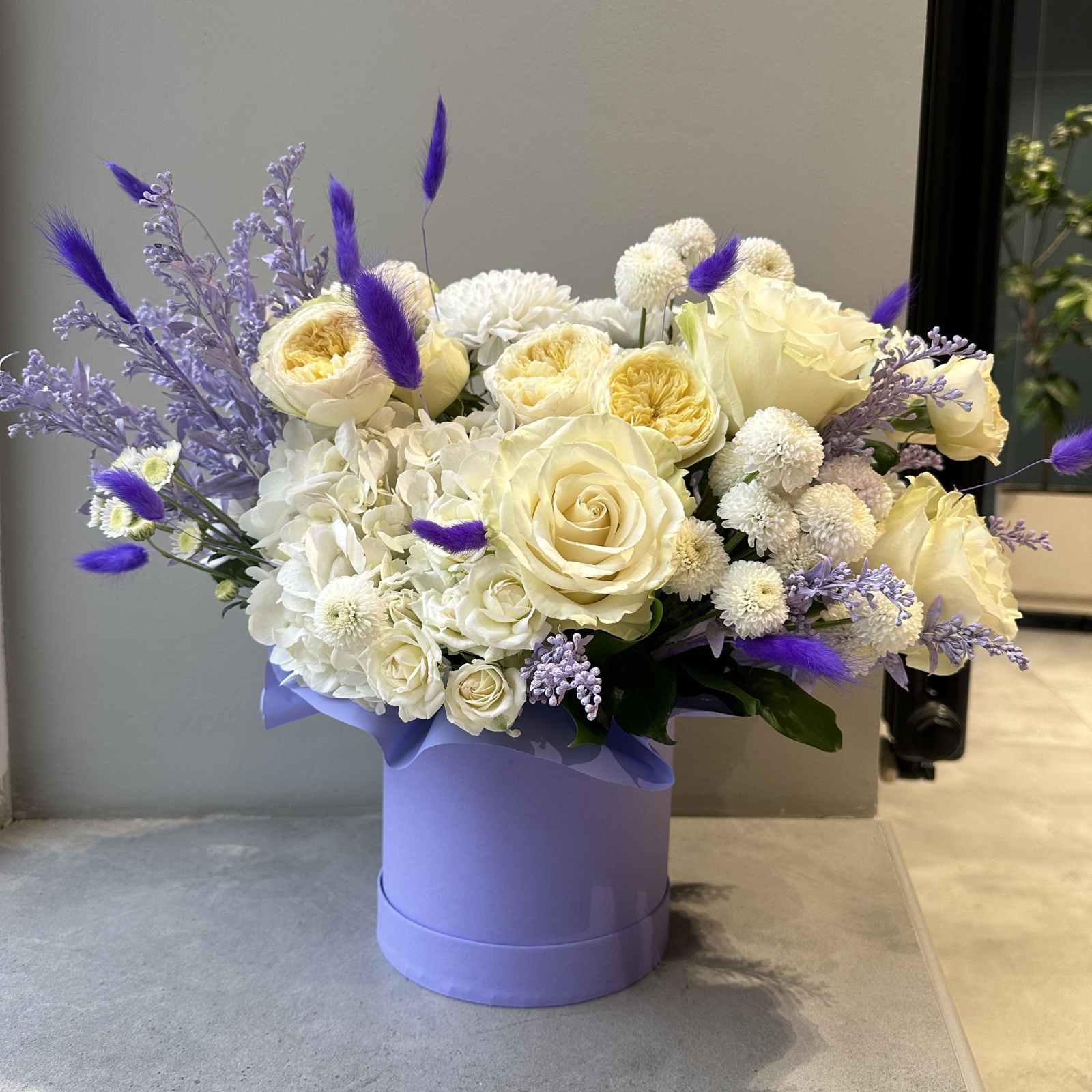 Состав: роза 3, хризантема кустовая 3, гортензия 1, роза кустовая 1, солидаго 1, рускус 0,2 и прочее. в наличии