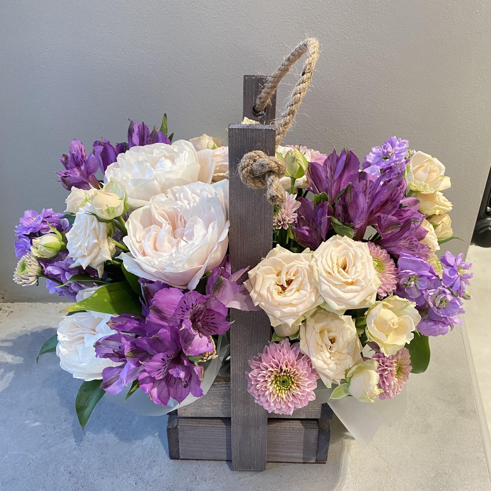 Состав: роза 3, альстромерия 3, роза кустовая 1, хризантема кустовая 1, маттиола 1, рускус 0,3 и прочее. в наличии