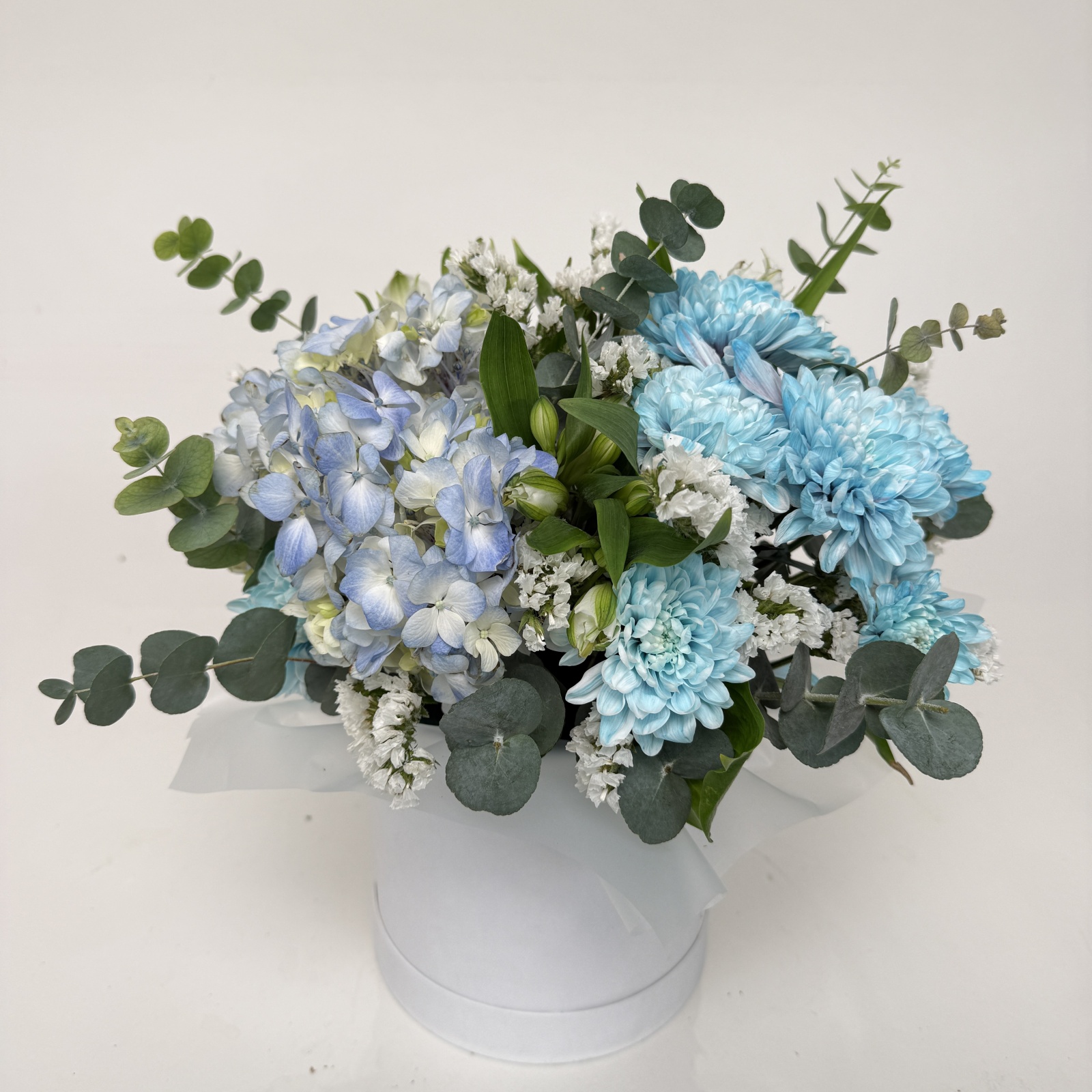 Состав: хризантема кустовая 4, альстромерия 3, гортензия 1, статица 1, эвкалипт 1, рускус 0,5 и прочее.