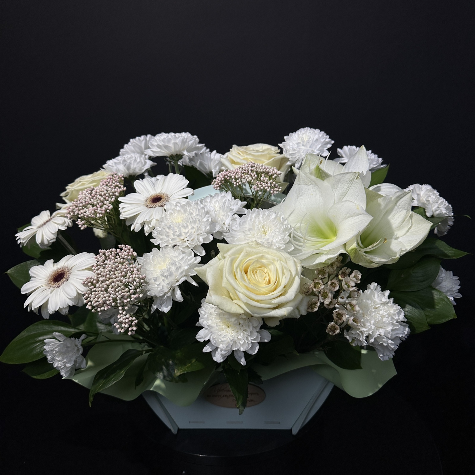 Состав: роза 4, хризантема кустовая 3, гербера 3, рускус 0,3 и прочее. под заказ