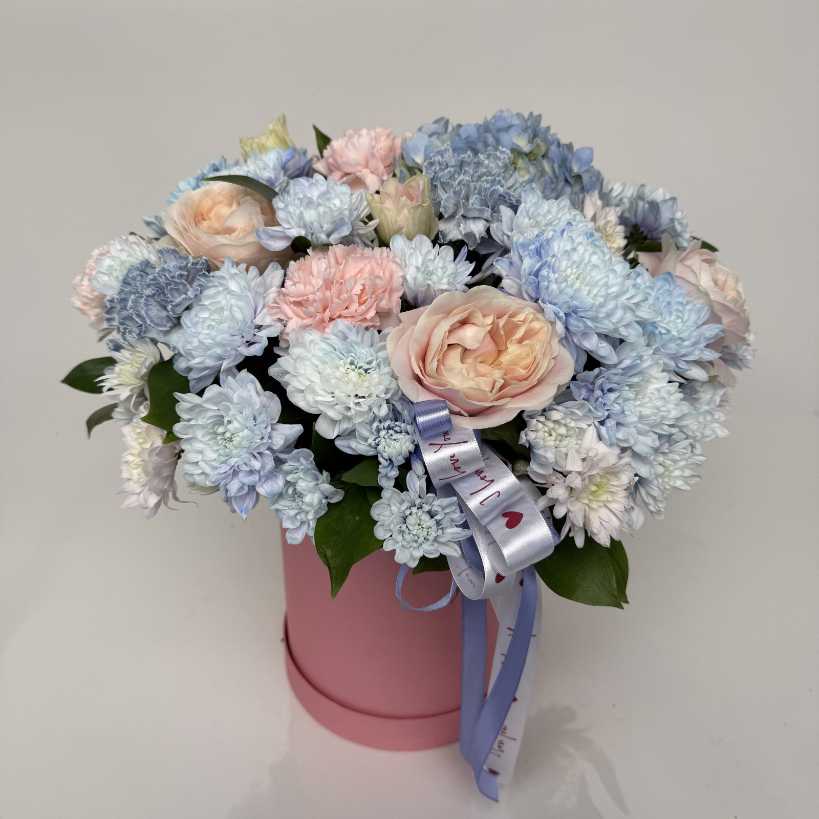 Состав: гвоздика 8, роза 6, хризантема кустовая 4, анемон 3, гортензия 1, эвкалипт 1, рускус 0,5 и прочее.