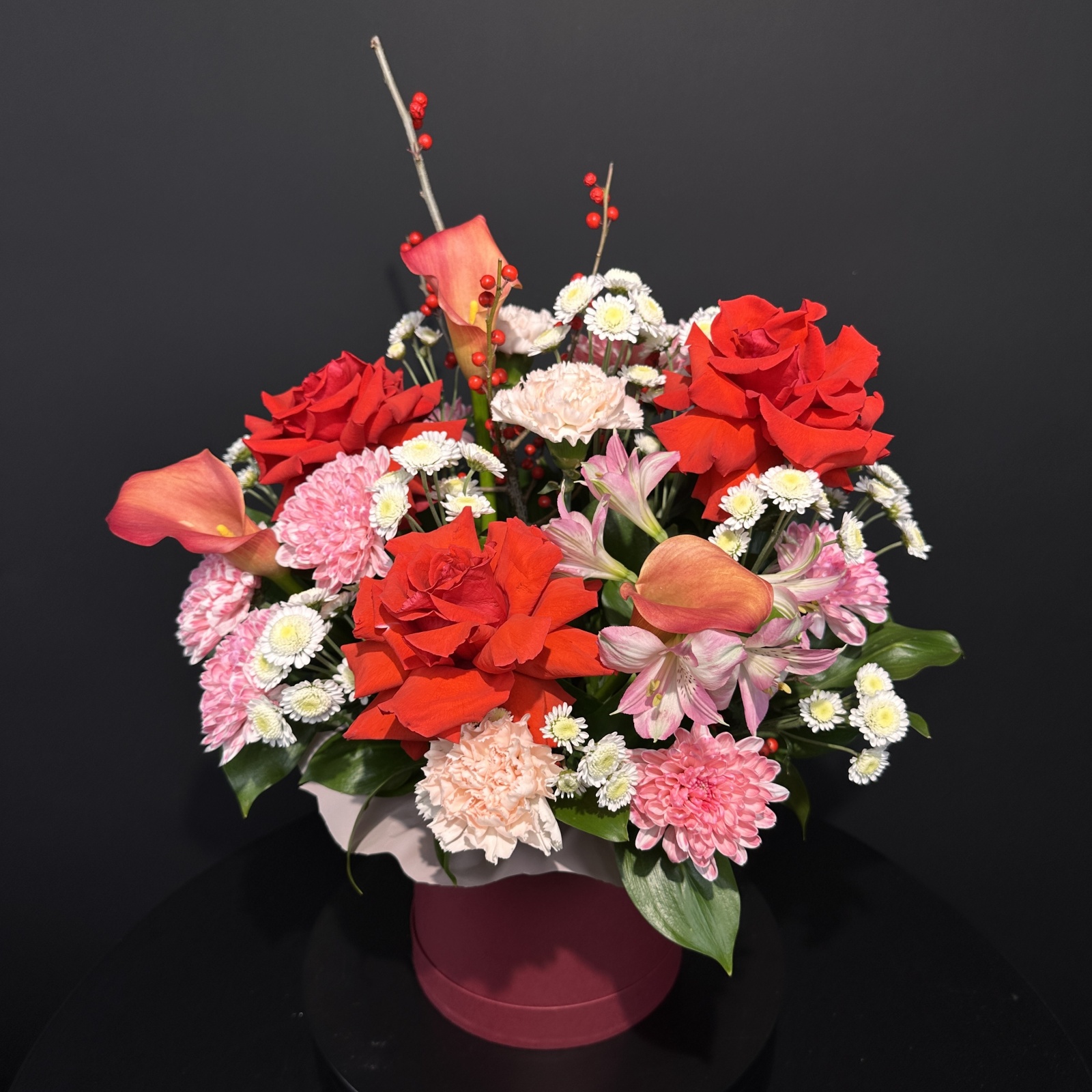 Состав: роза 4, гвоздика 3, хризантема кустовая 3, альстромерия 1, рускус 0,4 и прочее.