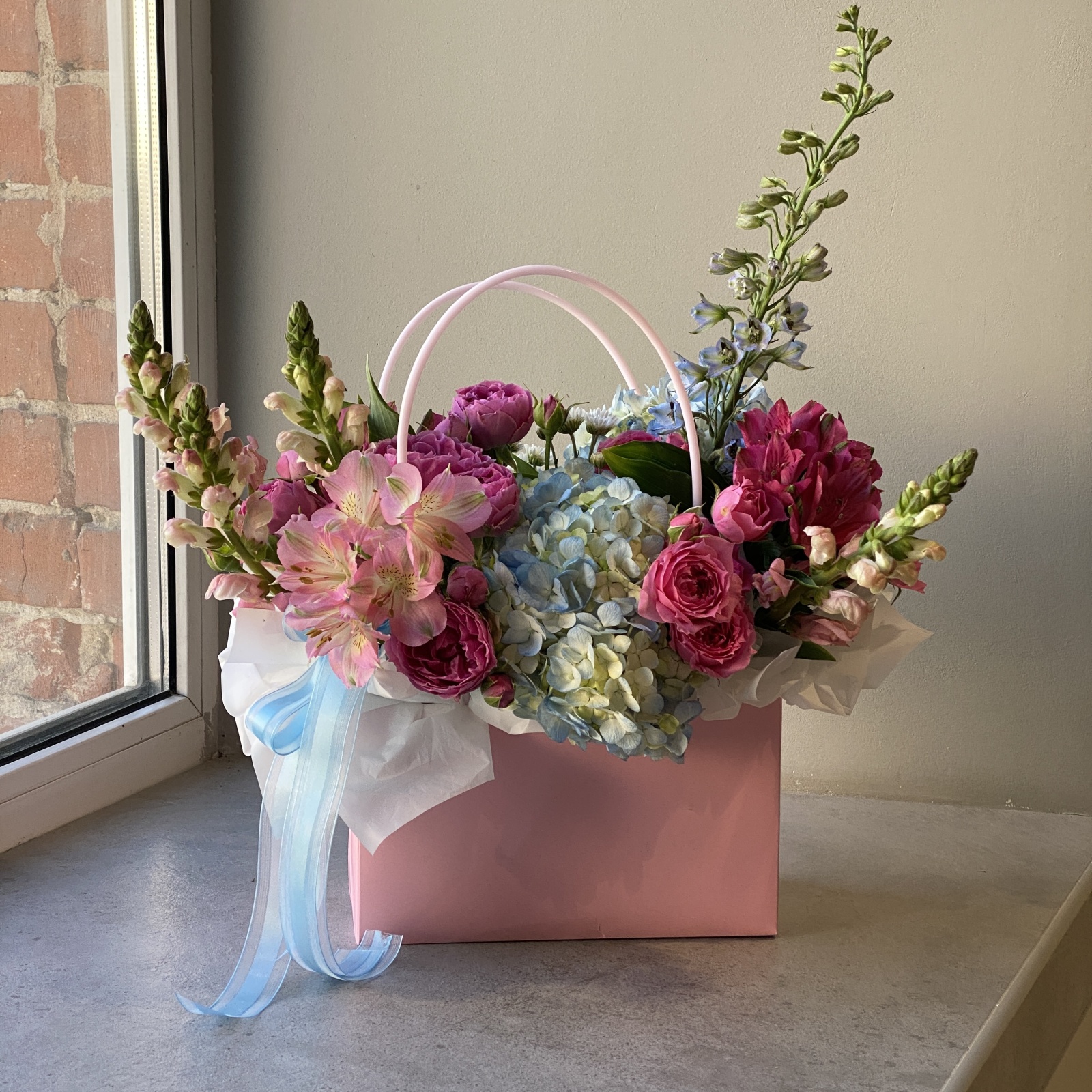 Состав: антирринум 4, альстромерия 3, гортензия 2, роза кустовая 1, дельфиниум 1 и прочее.