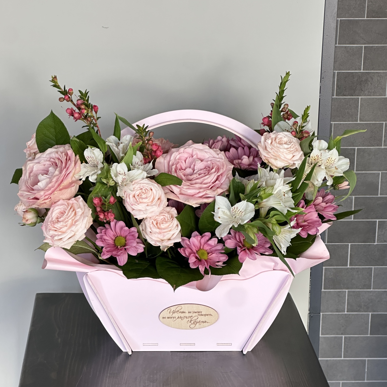 Состав: роза 3, альстромерия 3, роза кустовая 2, хризантема кустовая 2, хамелациум 1, салал 0,5 и прочее. под заказ