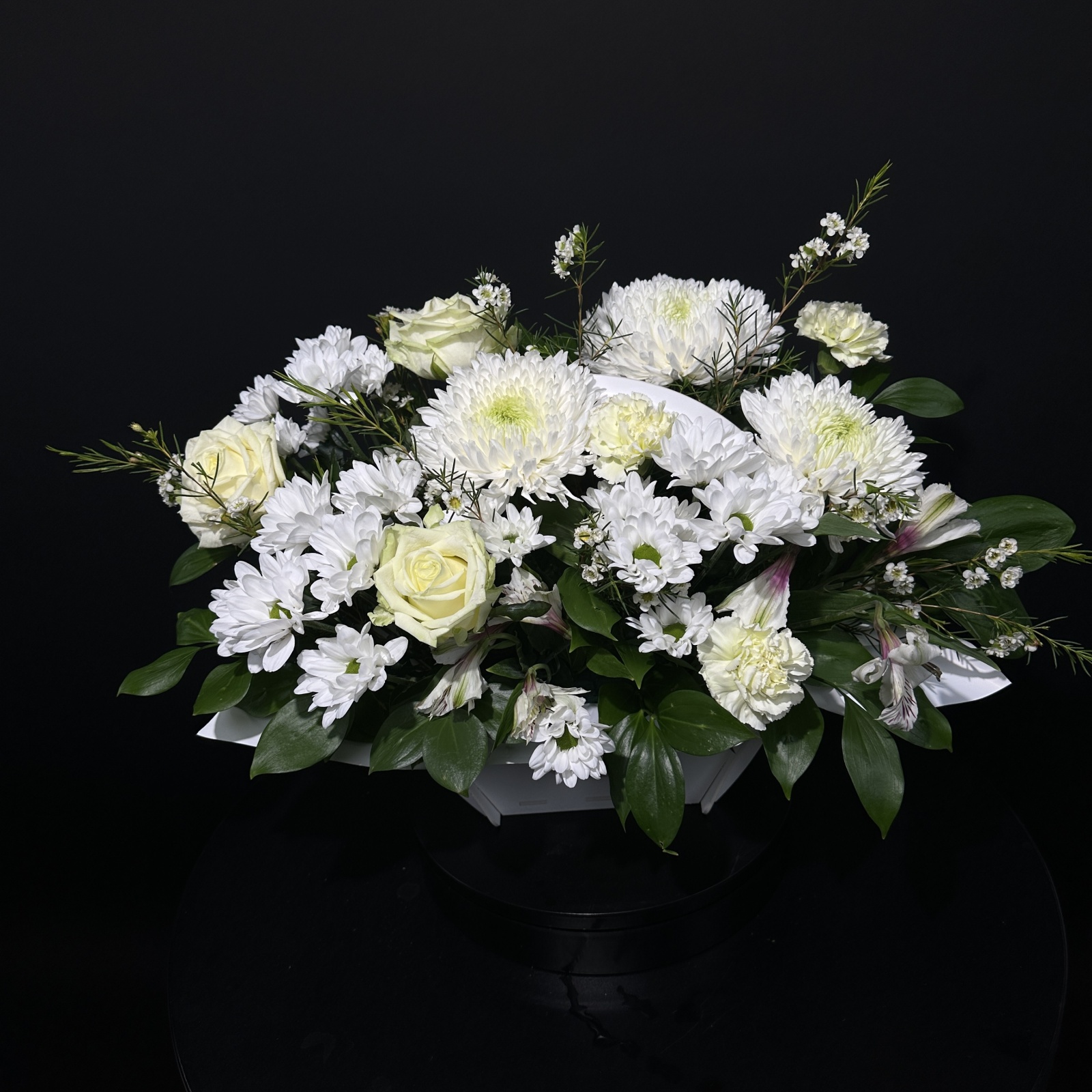 Состав: хризантема 3, роза 3, гвоздика 3, хризантема кустовая 3, альстромерия 2, рускус 0,3 и прочее. под заказ