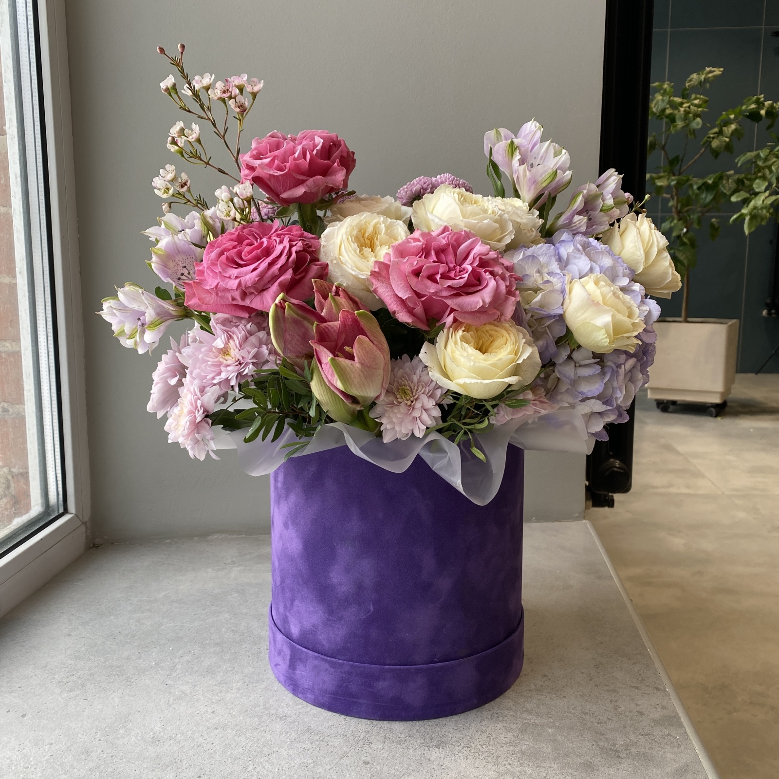 Состав: хризантема 2, альстромерия 2, роза кустовая 2, хризантема кустовая 1, гортензия 1, хамелациум 1, фисташка 0,2 и прочее. под заказ
