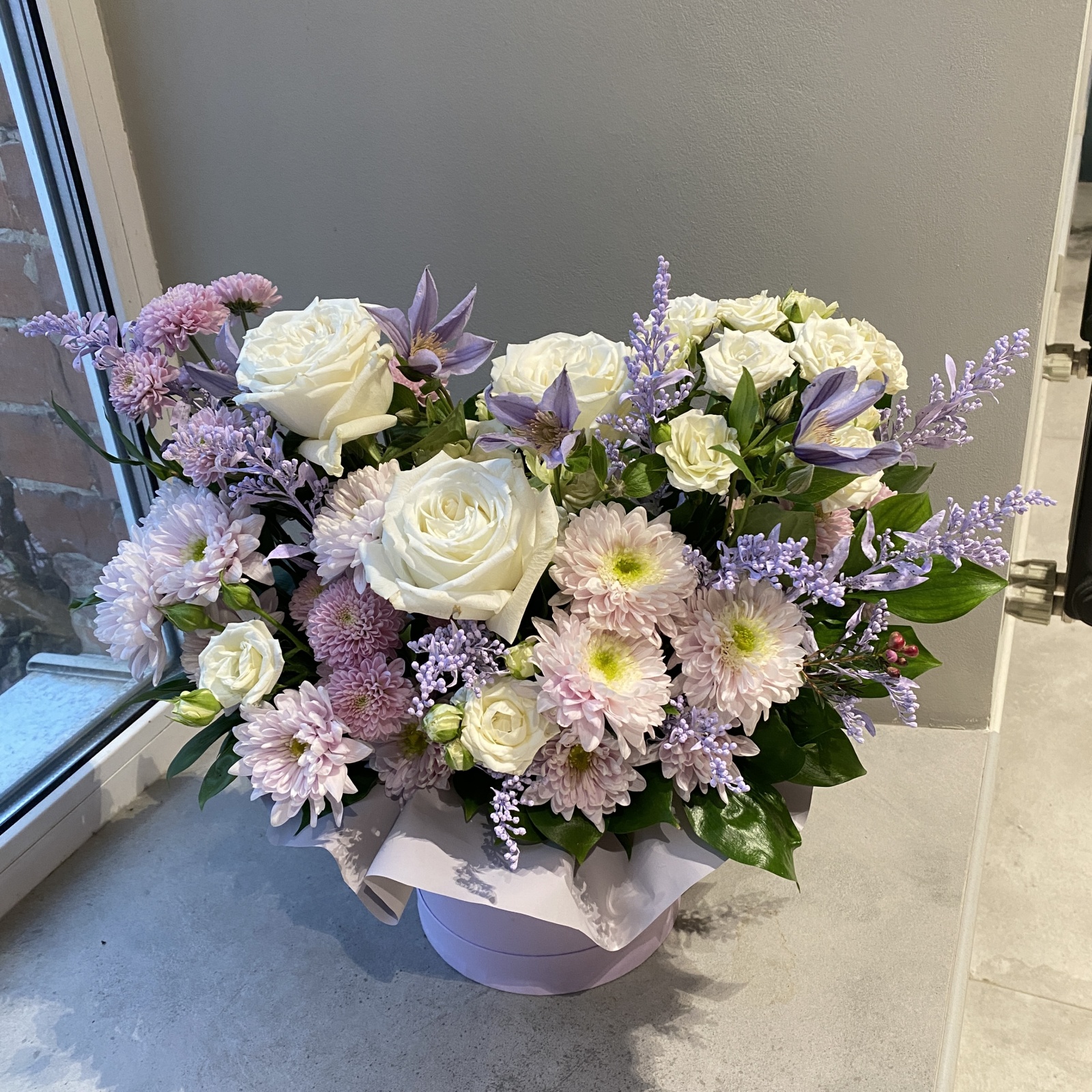 Состав: хризантема кустовая 6, роза 3, роза кустовая 1, клематис 1, солидаго 1, рускус 0,3 и прочее.