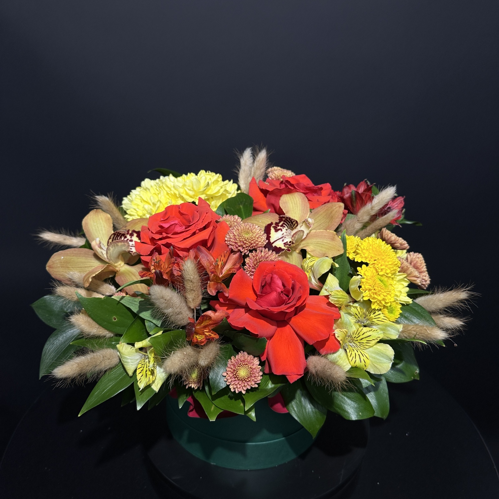 Состав: хризантема 3, роза 3, альстромерия 2, хризантема кустовая 1, рускус 0,5, ветка цимбидиум 0,2 и прочее.