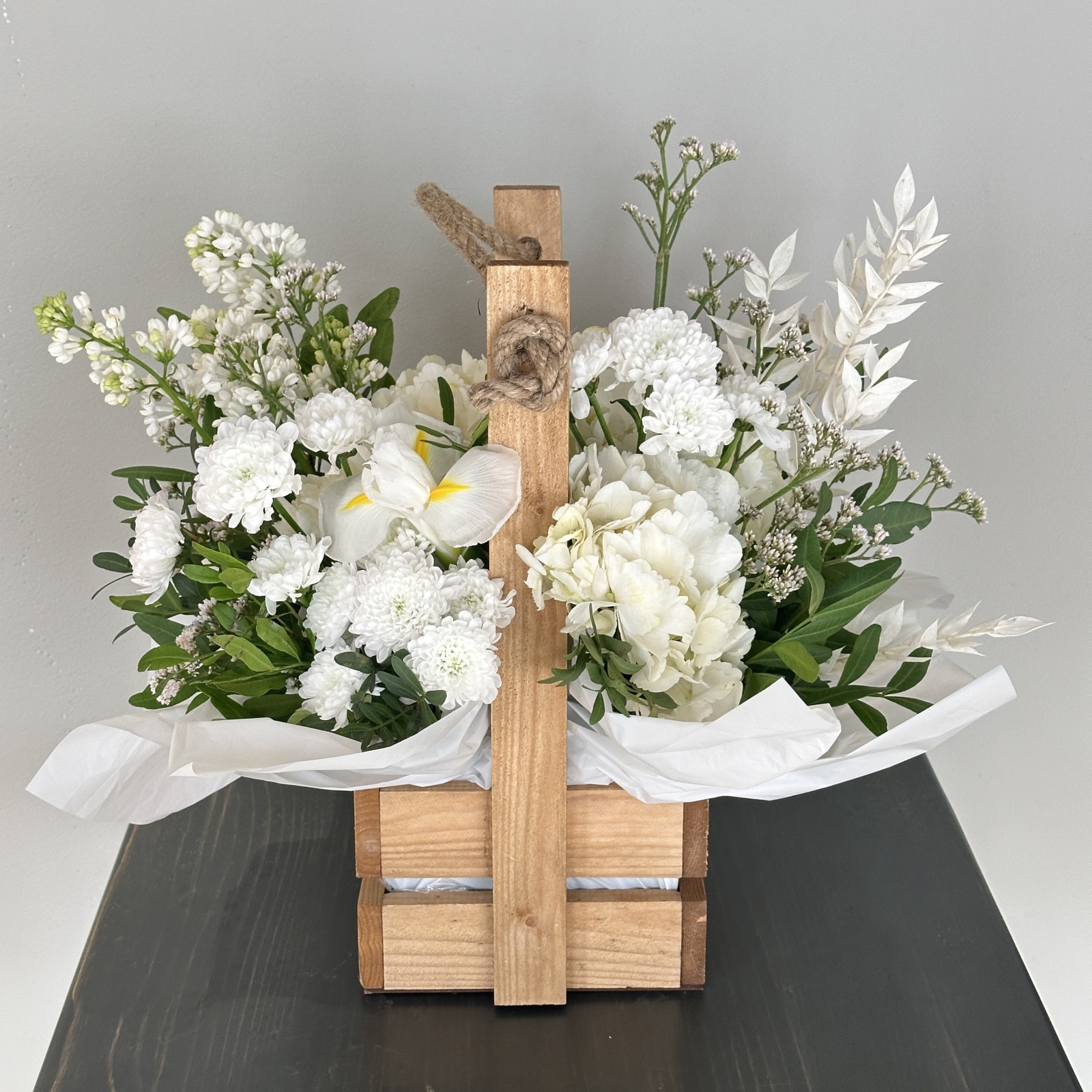 Состав: хризантема 3, ирис 1, гортензия 1, рускус 1, лимониум 1, сирень 1, фисташка 0,3 и прочее. в наличии