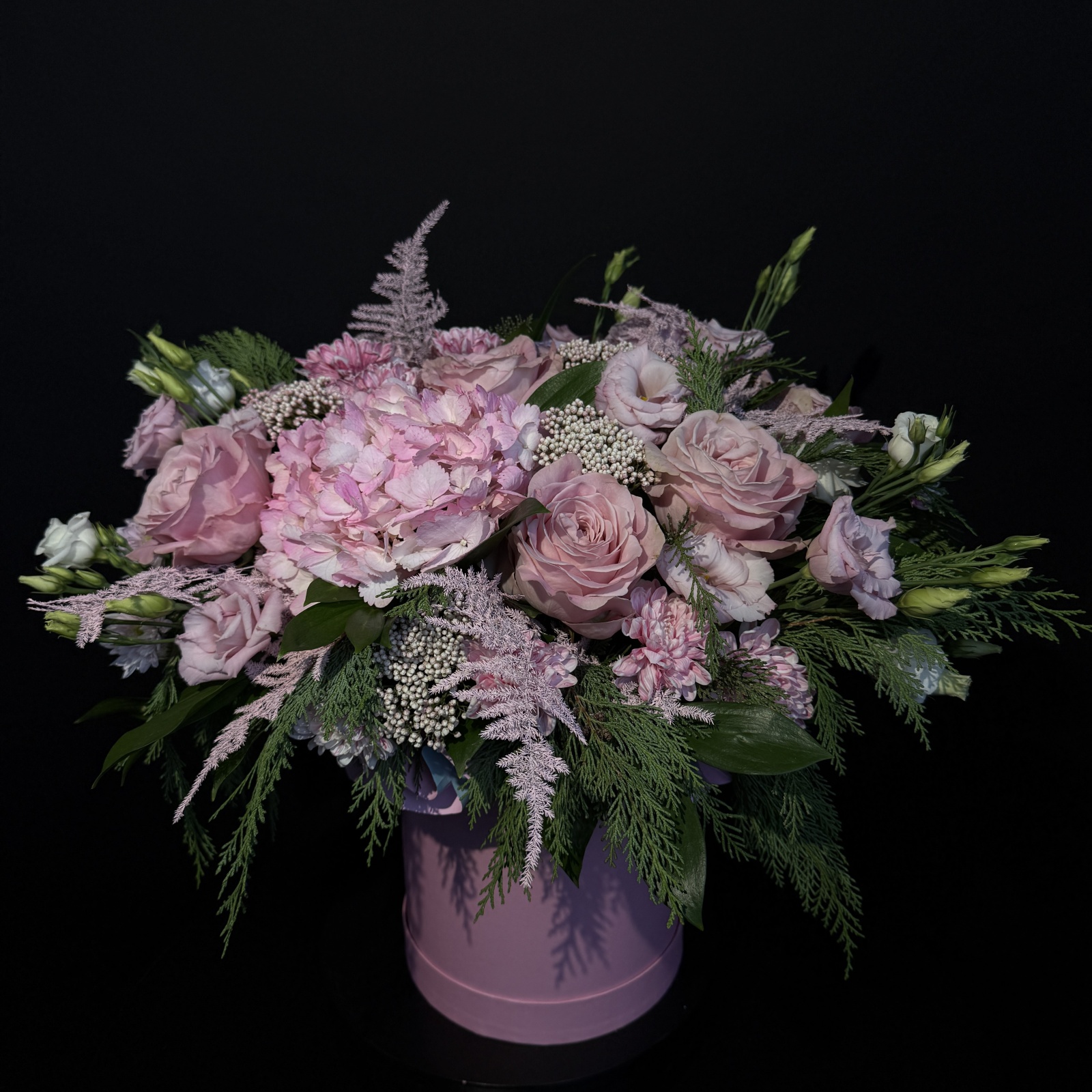 Состав: роза 6, лизиантус 3, хризантема 1, роза кустовая 1, хризантема кустовая 1, гортензия 1, рускус 0,4 и прочее.