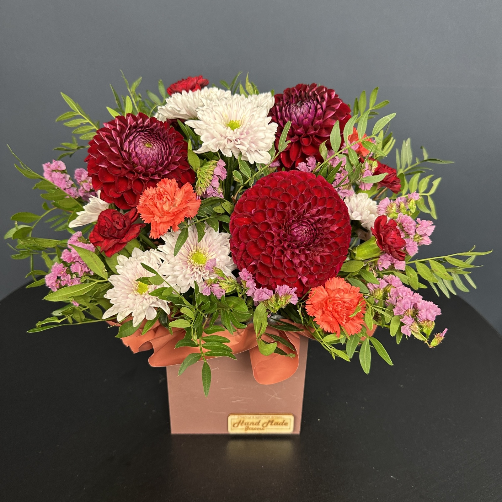 Состав: гвоздика кустовая 3, статица 2, хризантема кустовая 1, фисташка 0,25 и прочее.