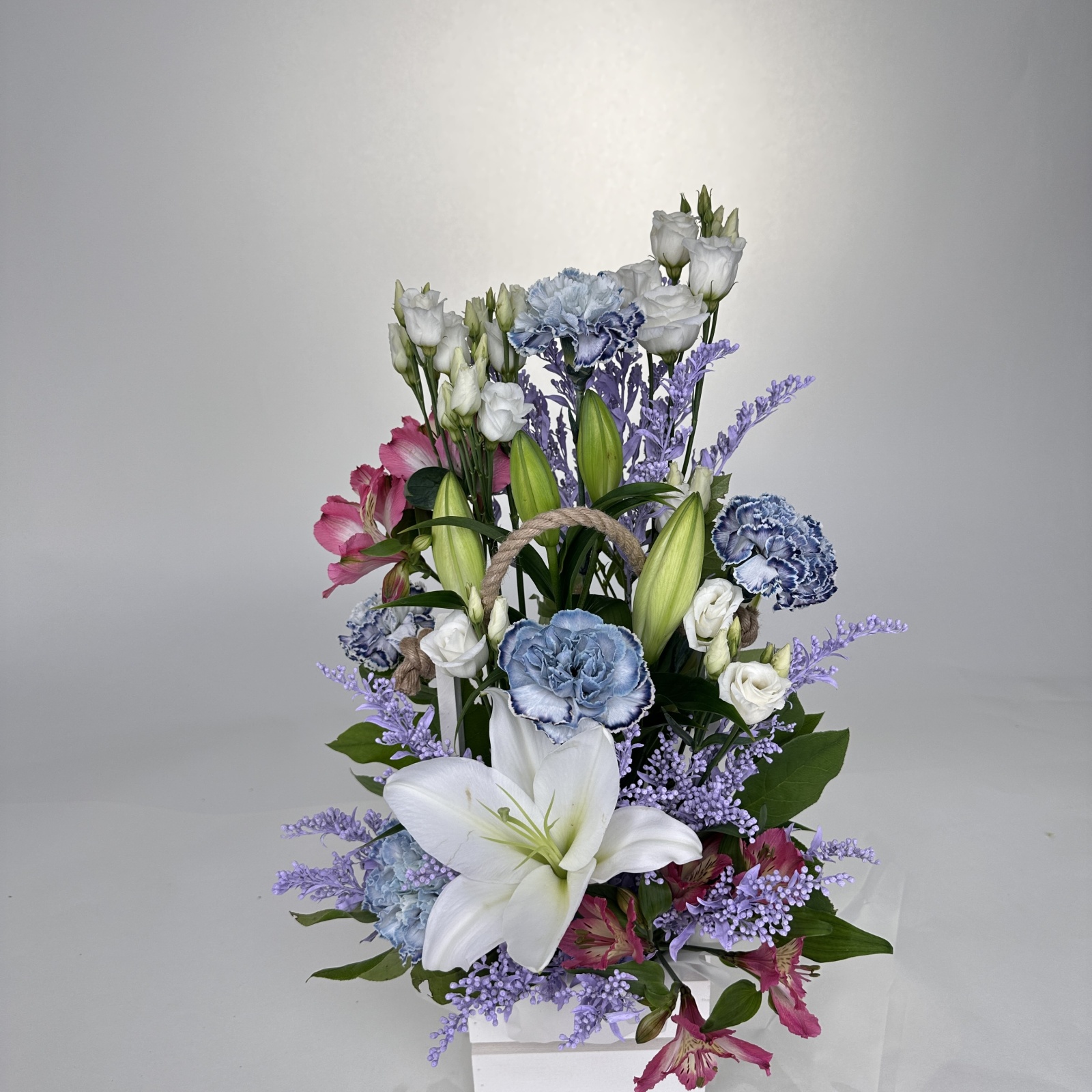 Состав: гвоздика 5, лизиантус 2, альстромерия 2, солидаго 2, лилия 1, салал 0,1 и прочее.