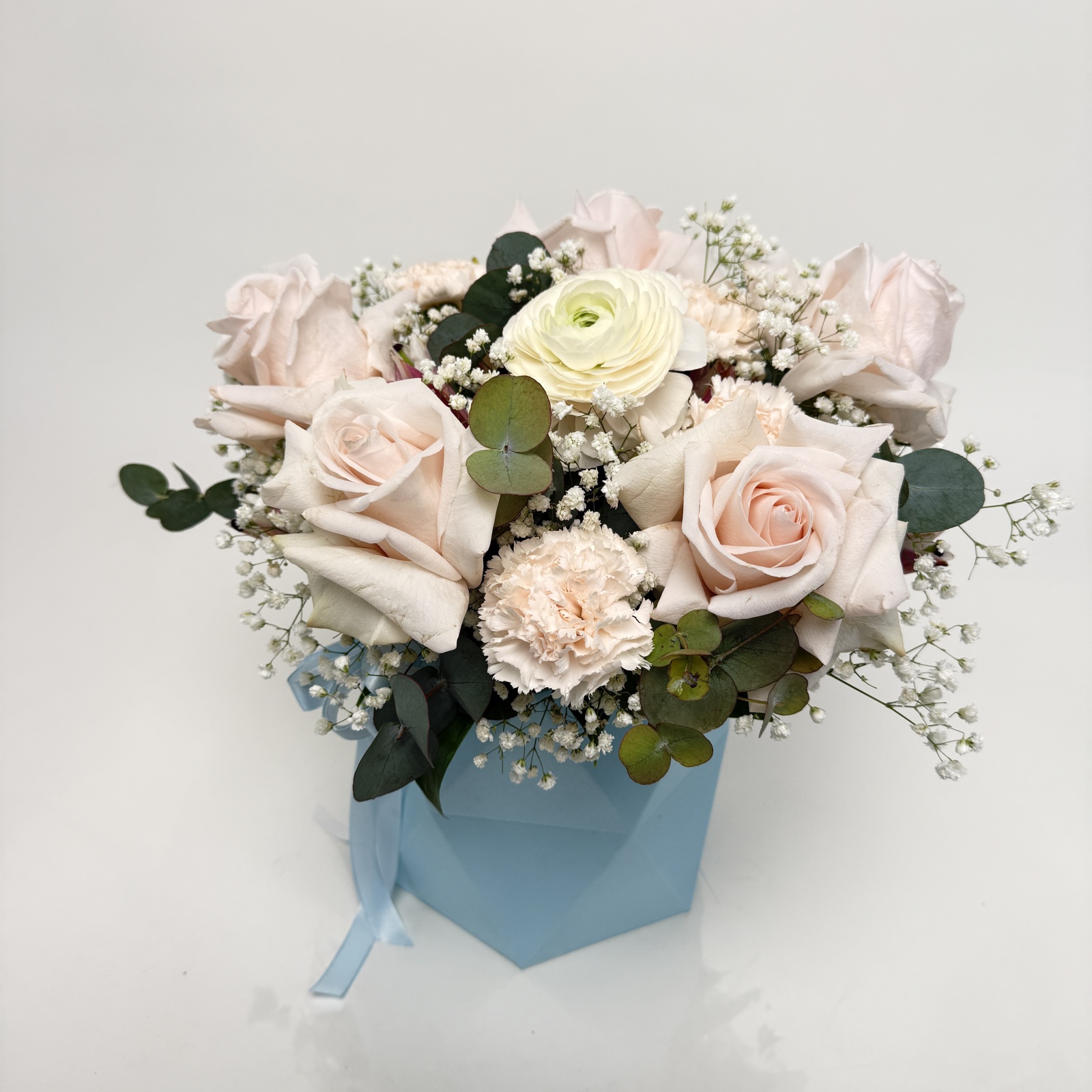 Состав: роза 8, гвоздика 5, эвкалипт 2, гипсофила 1, ранункулюс 1 и прочее. под заказ