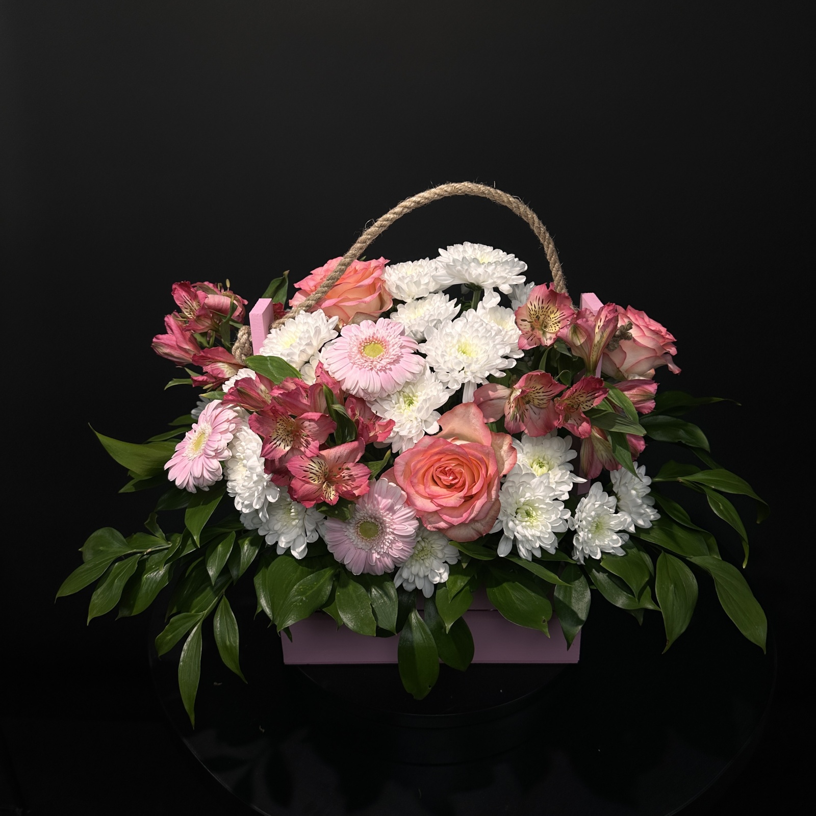 Состав: хризантема кустовая 4, гербера 3, роза 3, альстромерия 3, рускус 0,5 и прочее. под заказ