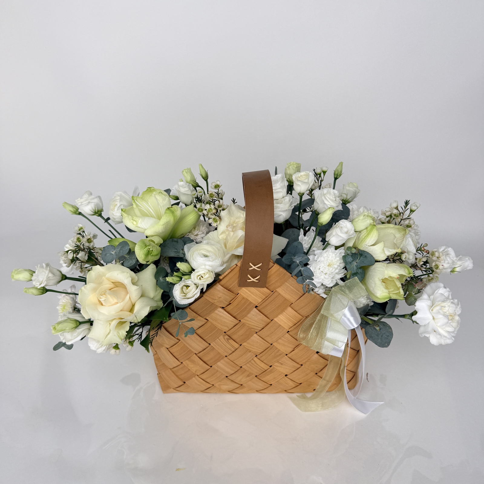 Состав: ранункулюс 4, роза 3, гвоздика 3, хамелациум 2, эвкалипт 2, лизиантус 2, хризантема кустовая 1 и прочее. под заказ